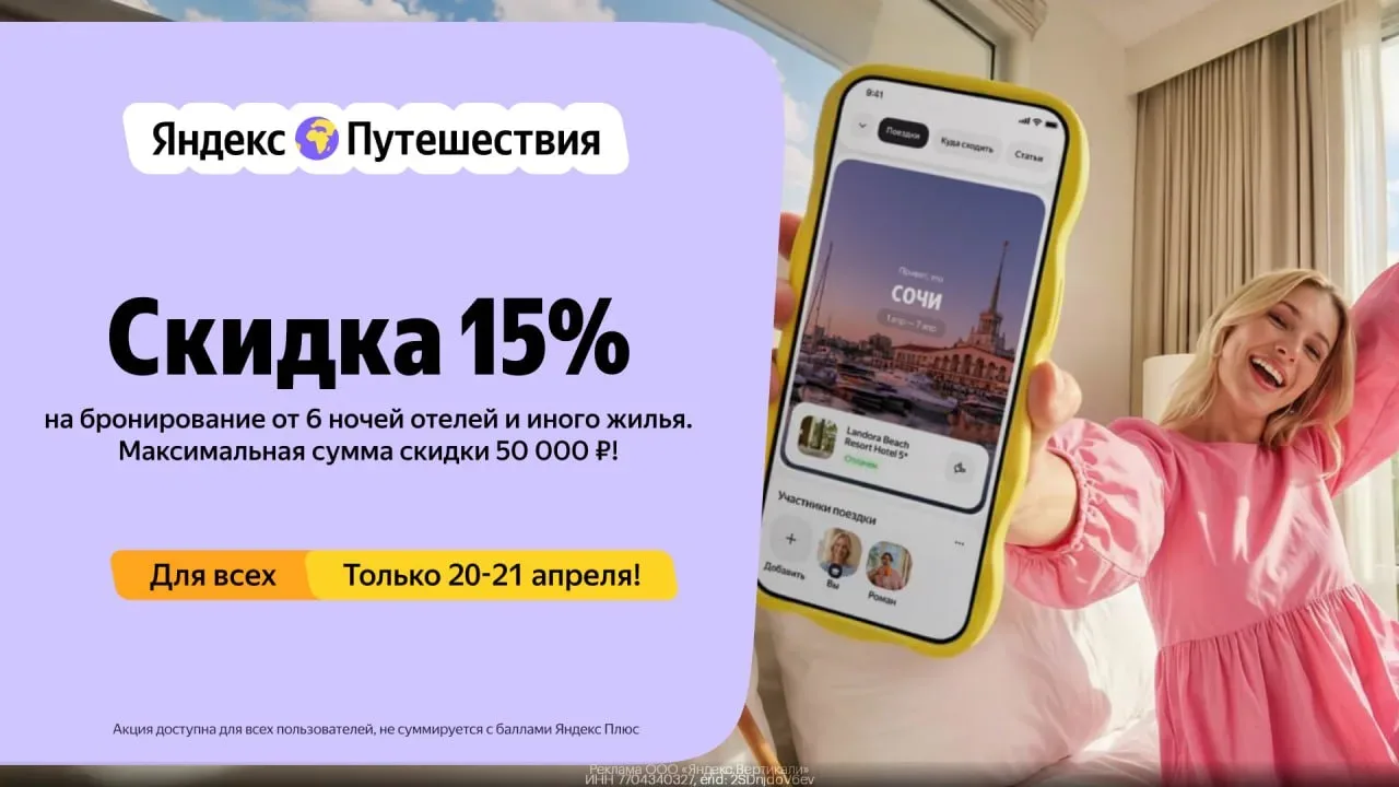 🌍 Яндекс Путешествия: скидка до 50к на бронирование жилья ⚡ В Яндекс Путешествиях новый промик — скидка 15% при бронировании жилья от 6 ночей. Работает только СЕГОДНЯ и завтра, 20–21 апреля. Что важно знать: 🤩 Промокод: GB-MAYSKIEI5-C6Q4P 🤩 Скидка: 15%, максимум 50 000₽ 🤩 Минимум: 6 ночей 🤩 Работает на сайте и в приложении, для всех городов 🤩 Не суммируется с баллами Яндекс Плюса По выгоде: при бронировании на 40 000₽ экономишь 6 000₽. При 100 000₽ — уже 15 000₽. Максимум срабатывает при заказе от ~333 000₽ — там и будет полные 50к. 👉 Получить скидку 15% на бронирование жилья 🇷🇺 Подписаться в…