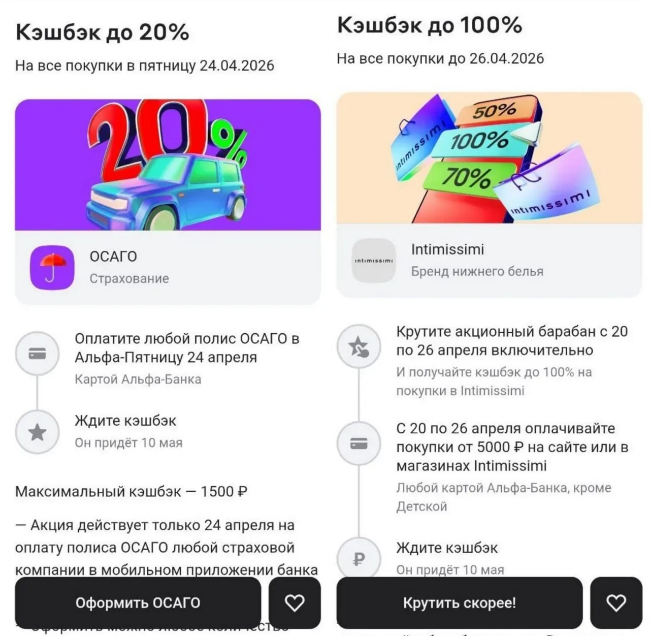 ❤️ Альфа Пятница: 20% на ОСАГО ⚡ На этой неделе Альфа-Пятница — кэшбэк 20% за оплату ОСАГО через агрегатор Insapp в приложении или интернет-банке, максимум 1500₽ (или 2000₽ для А-Клуба). 💳 Оплата только 24 апреля. В остальные дни до 31 мая — 10% на полис от АльфаСтрахование и 5% на другие СК, максимум 1000₽. FAQ / Правила И ранее писал, что в приложении сейчас доступен барабан Intimissimi: можно покрутить и получить от 20 до 100% кэшбэка на покупки от 5000₽. Акция работает до 26 апреля, лимит — до 6000₽. Исключения: оплата айфоном, курьеру, Детской картой и сертификаты. FAQ / Правила Бонусы о…