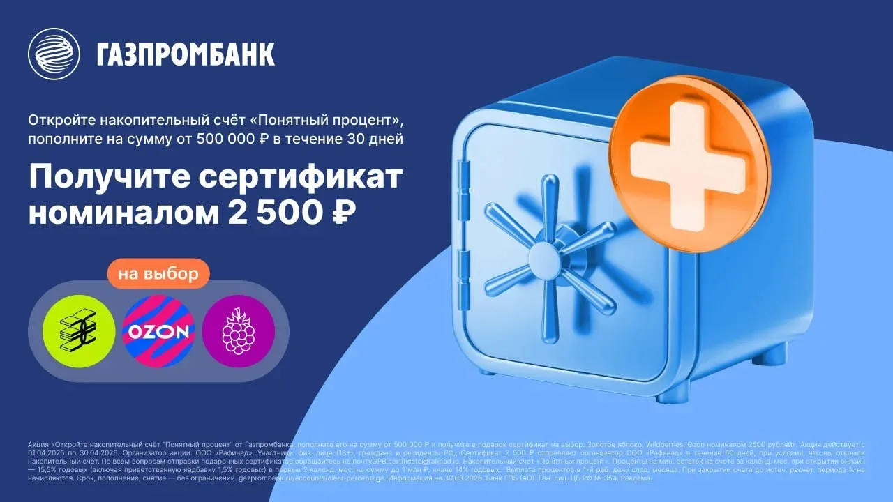 😃 Газпромбанк: 2 500 ₽ сертификатом за открытие НС «Понятный процент» 🛍 🛍 🛒 Газпромбанк запустил акцию по НС «Понятный процент»: открываем счёт, пополняем от 500к и держим минимум 30 дней — получаем сертификат на 2500₽ в Ozon, Wildberries или «Золотое яблоко». Правила Условия акции ✅ Акция действует до 30.04.26 ✅ НС нужно открыть по акционной ссылке ✅ Пополнить от 500к в течение 30 дней после открытия ✅ Держать мин. остаток от 500к не менее 30 дней 👨💼 Только для новых клиентов без вкладов и НС в банке (и без заявок) за последние 180 дней. Сертификат придёт в СМС в течение 60 дней — номер тел…