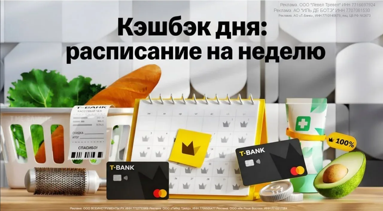 🏦 Т-Банк: предварительное расписание кэшбэка дня на эту неделю. Источник 20 апреля 👑 Kitfort, 12% за одну покупку, максимум — 2 000 ₽. 👑 Анализы в СберЗдоровье, 35% за все покупки. 👑 Level.Travel Туры, 8% за все покупки. 👑 Level.Travel Отели, 14% за все покупки, максимум — 15 000 ₽. 👑 Nutribullet, 15% за все покупки, максимум — 20 000 ₽. 21 апреля 👑 Сюрприз 22 апреля 👑 Kenwood, 17% за все покупки, максимум — 20 000 ₽. 👑 Protein Rex, 40% за все покупки, максимум — 2 000 ₽. 👑 HunterPet, 40% за все покупки. 23 апреля 👑 Travelata.ru, 7% за все покупки. 24 апреля 👑 Huggies в Пятерочке, до 45% за в…