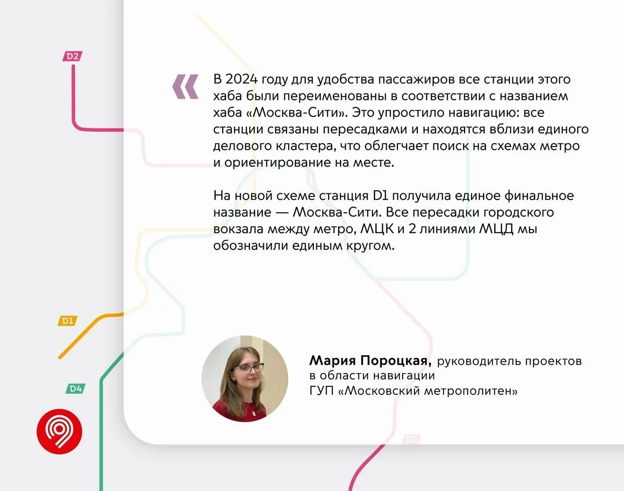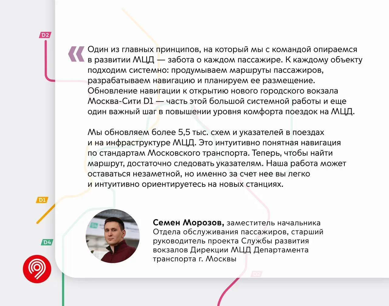 К открытию городского вокзала Москва-Сити D1 обновляем более 73 тыс. элементов навигации на станциях, в поездах метро, МЦК и МЦД. Мэр Москвы Сергей Собянин и генеральный директор ОАО «РЖД» Олег Белозеров открыли новый московский городской вокзал Москва-Сити D1. Теперь пересадки между метро, МЦК, D1 и D4 осуществляются здесь в сухом контуре, а на схемах хаб «Москва-Сити» обозначили единым кругом. Что об этом говорит команда Московского транспорта — в карточках 👆 Чтобы информация на объектах столичного транспорта была актуальной, мы обновляем: 🔹 Более 5,5 тыс. схем и указателей в поездах и на и…