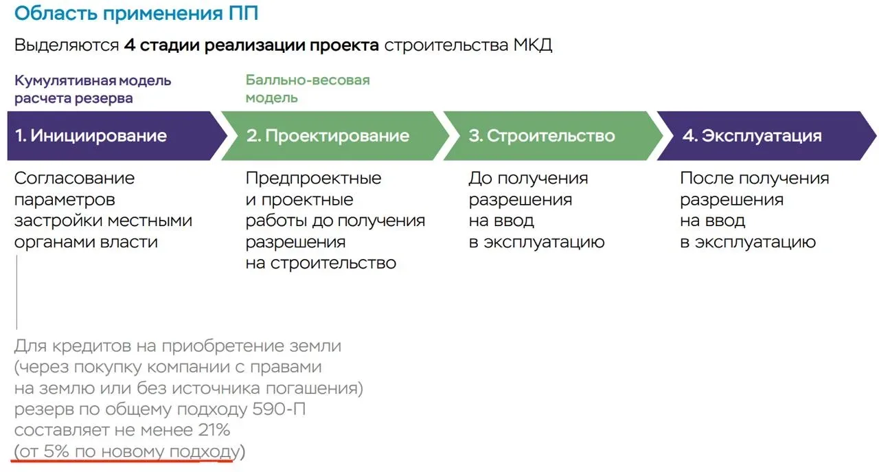 🏦 ЦБ поможет застройщикам (но далеко не всем) ЦБ выпустил для обсуждения предложение по формироваию резервов по кредитам для создания МКД и иных объектов недвижимости и, несмотря на громкое "«штрафуем» за нецелевое использование", для крупных публичных застройщиков это принесет удешевление одного из самых болезненных этапов проекта. Собственно, развитие тезиса из заголовка на картинке - с новых подходом кредиты на покупку земли идут с минимальным резервом 5% ( а не 21% как ранее). Доступно это при условии, что застройщик в хорошем финанасовом положении, т. е. выполняются три условия: • есть д…