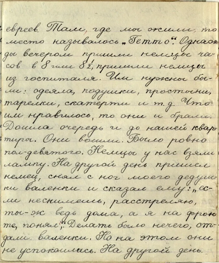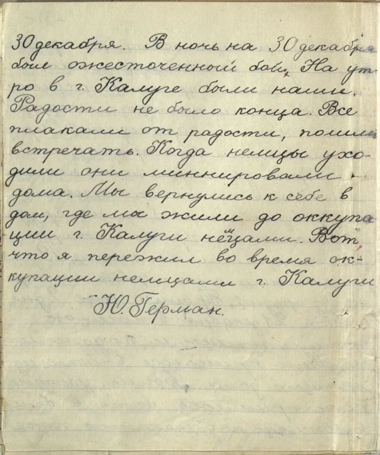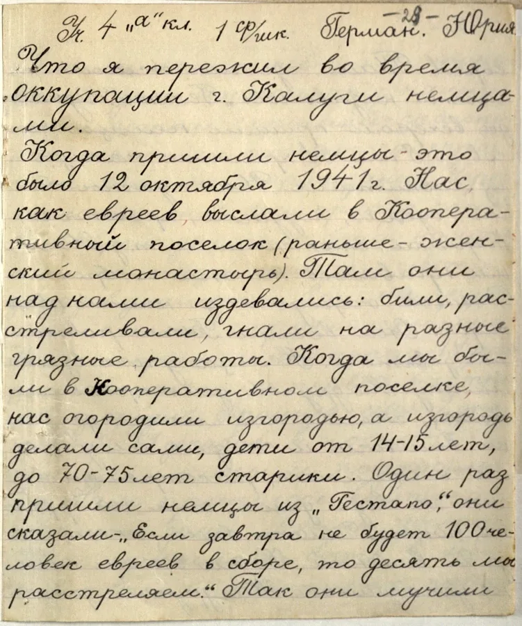 😭 «Там они над нами издевались: били, расстреливали, гнали на разные грязные работы» Так написал в своём сочинении ученик 4 «А» класса средней школы № 1 Юрий Герман. Он сделал это через год после освобождения Калуги от фашистов. Мальчик рассказывает, что ему пришлось пережить во время оккупации. 12 октября 1941 года в Калугу вошли немцы. Всех евреев согнали в кооперативный посёлок, где раньше был женский монастырь. «Когда мы были в кооперативном поселке, нас огородили изгородью, а изгородь делали сами дети от 14-15 лет до 70-75 лет старики», — пишет Юра. Это место называли «гетто». Часто туда…