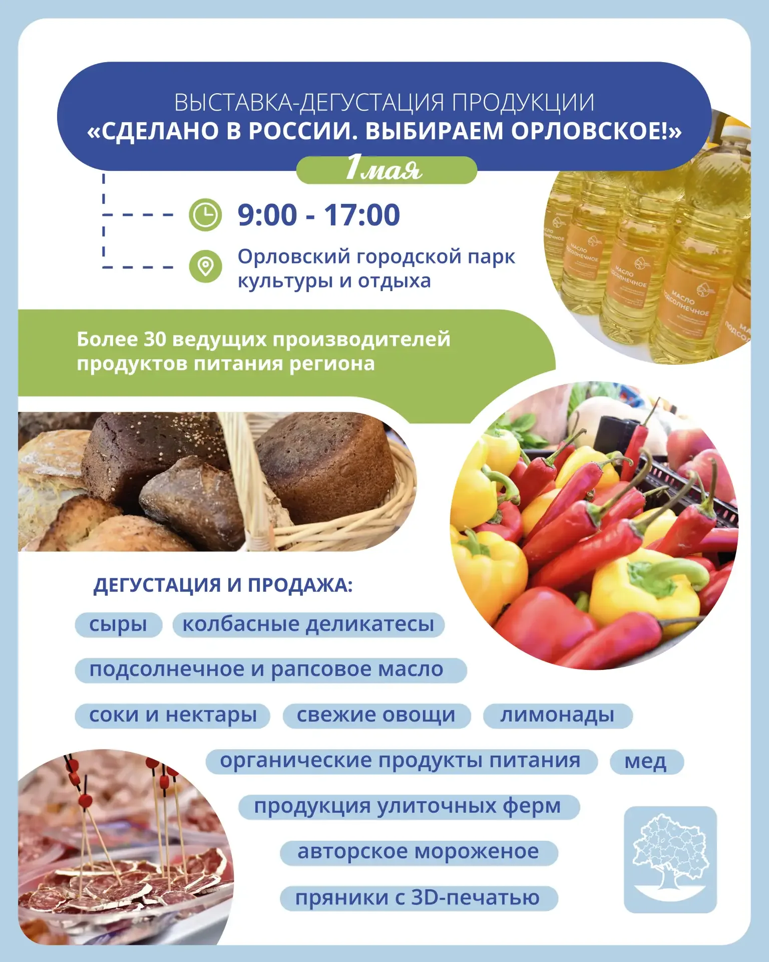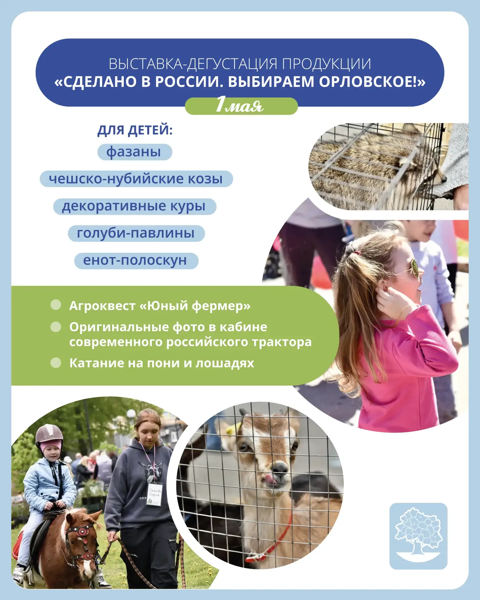 В этом году Праздник Весны и Труда в Орле будет еще масштабнее! По сложившейся традиции, 1 мая в городском парке весь день будет работать выставка-дегустация «Сделано в России. Выбираем орловское!». Местные сельхозпроизводители представят огромный ряд продукции собственного производства – от сыров и колбас до пряников и улиток. Можно будет и попробовать, и купить понравившиеся продукты. Отдельная программа предусмотрена для детей. Юные посетители выставки смогут познакомиться с редкими видами домашних животных, поиграть в фермеров, покататься на пони и лошадях. Впервые в нашем городе пройдет …
