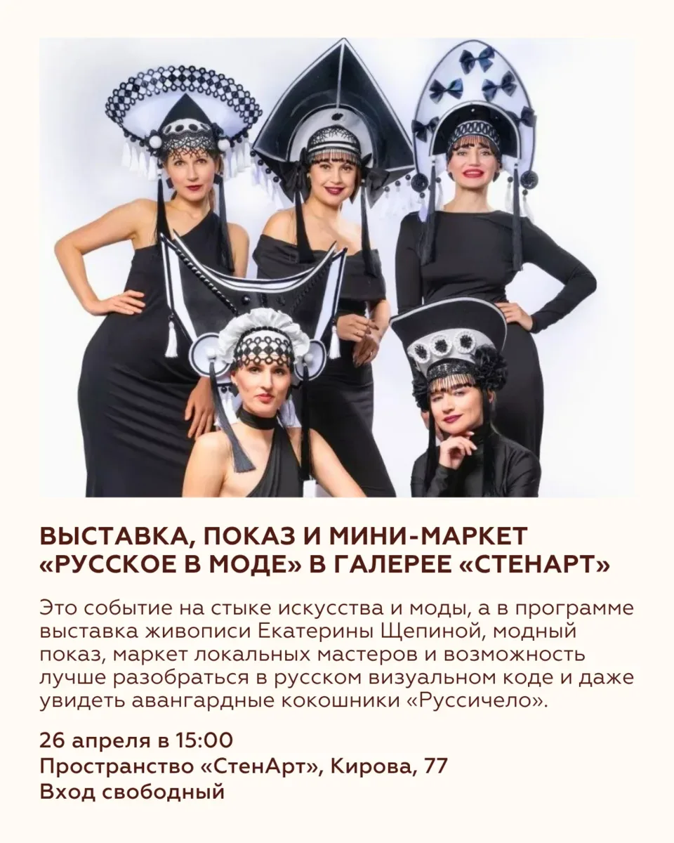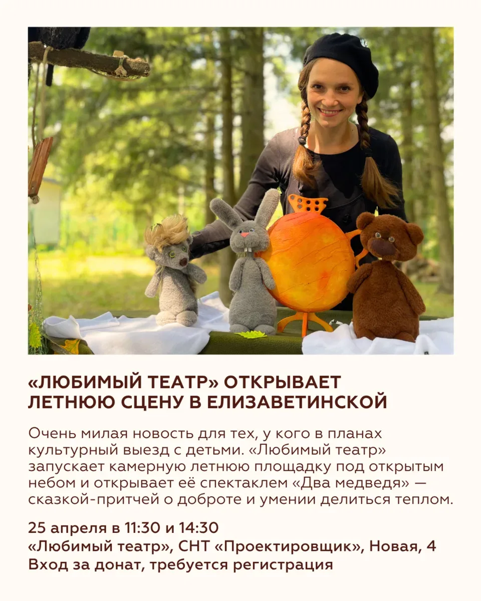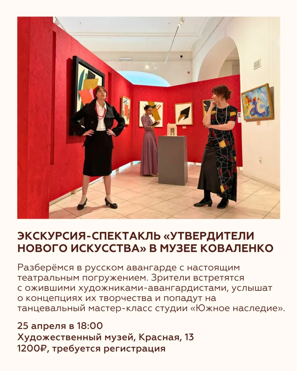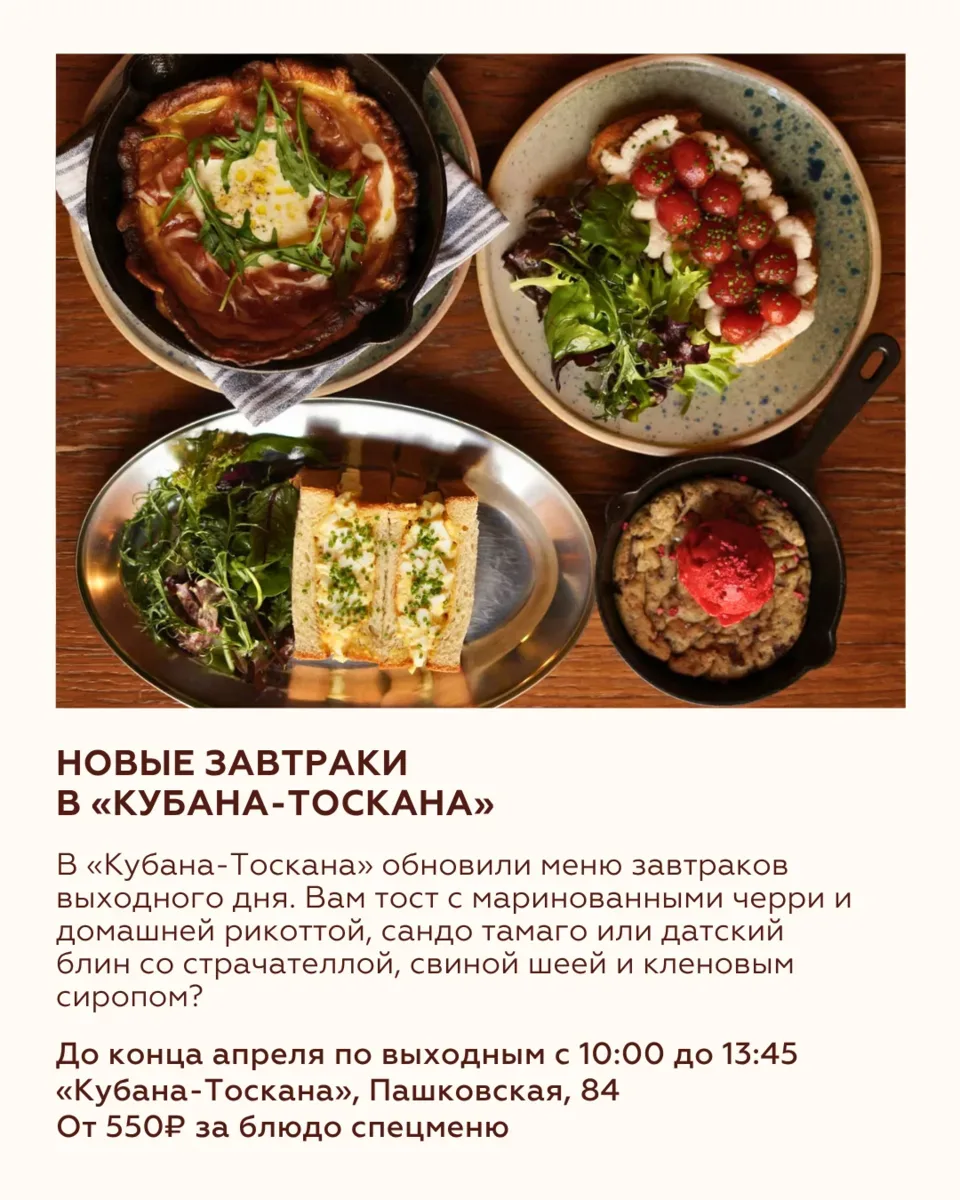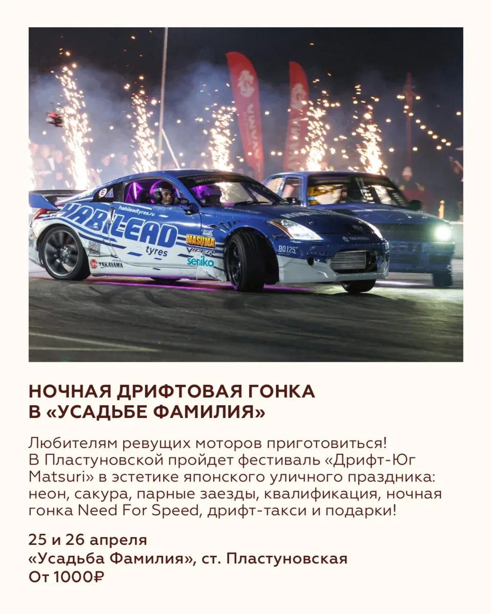 ВОСЕМЬ СОБЫТИЙ НЕДЕЛИ 20—26 апреля Пора определяться, кто вы на этой неделе: человек, который едет на дрифт в стиле NFS, покупает искусство на фестивале локальных идей, идёт на спектакль под открытым небом или ведёт питомца в кофейню. А можно выбрать всё сразу! Ловите события, которые помогут жить интересно и красиво! 🌸 Дрифтовая гонка — https://max.ru/join/mLRiYvckM9JZjB9rT970S5GfndmJDyvjgEasCGQ5SmU 🌸 Экскурсия в Музее Коваленко — 8(861) 268-49-68 🌸 Саженцы сосны на фестивале «Дом» —@festival.dom 🌸 «Хвостатый вторник» — @barzanoza 🌸 Завтраки в «Кубана-Тоскана» — @kubana.toscana 🌸 «Русское в …