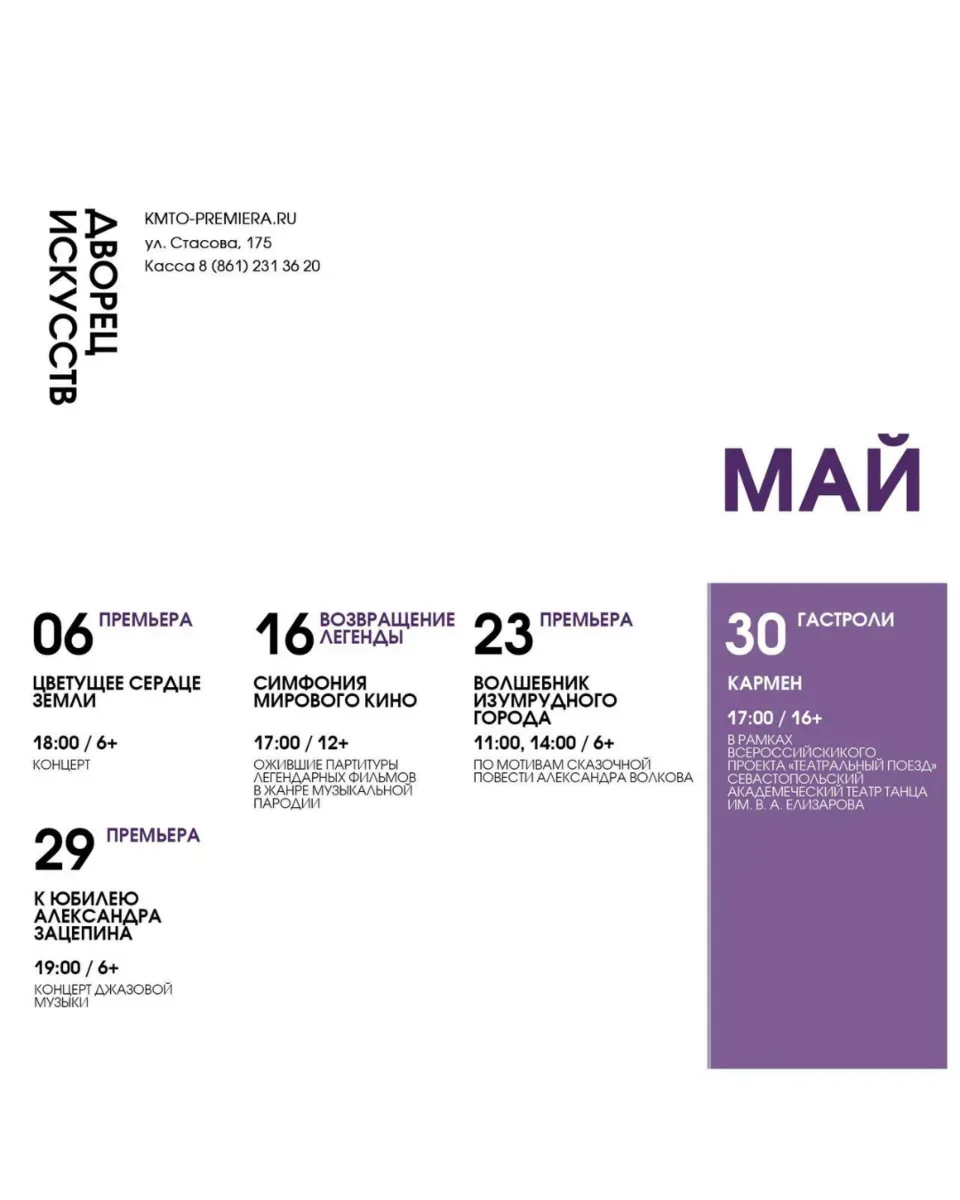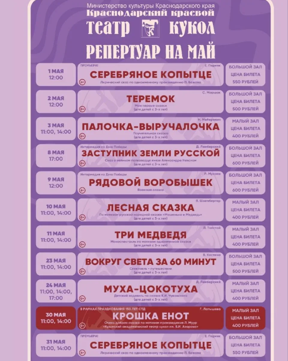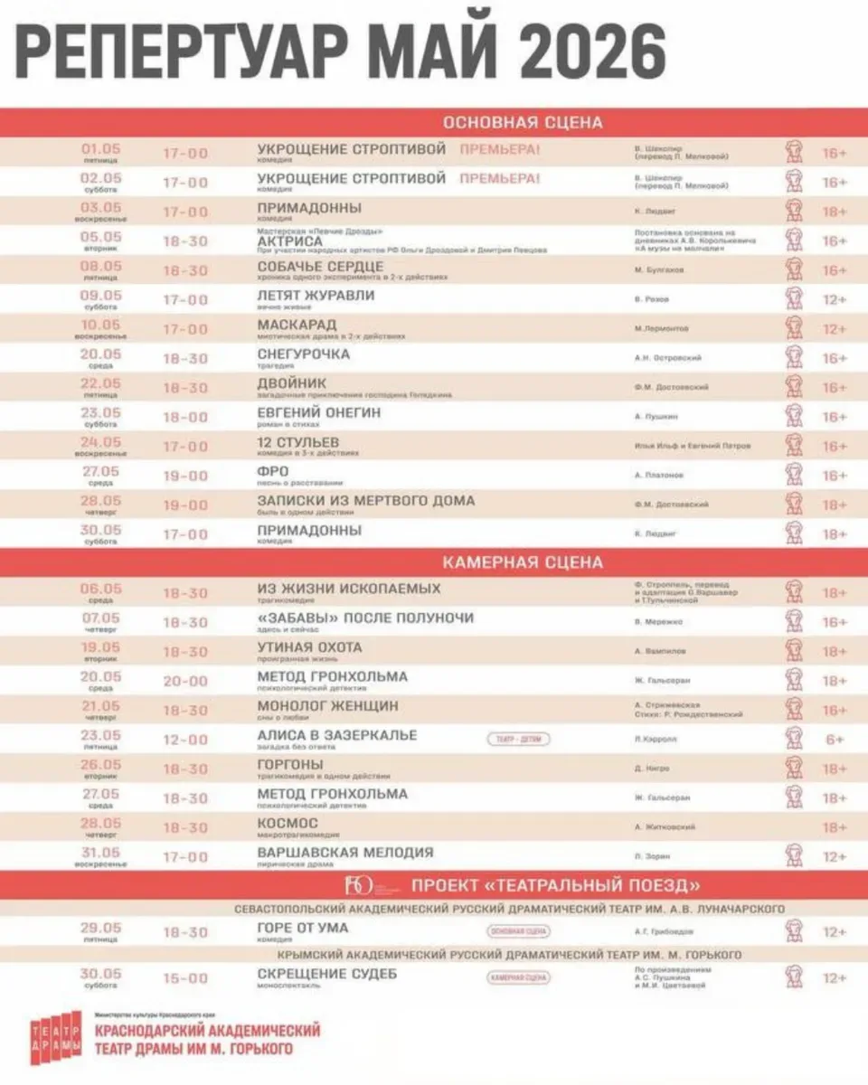 АФИШИ «БОЛЬШИХ» КРАСНОДАРСКИХ ТЕАТРОВ НА МАЙ Уже строите планы на майские? Рекомендуем не ограничиваться новыми рецептами маринада и уже сейчас заглянуть за билетами в театр. В конце концов, шашлык шашлыком, а выход в свет — это святое! Выбирайте даты прямо сейчас, хорошие места быстро заканчиваются! 🎭 Краснодарский театр драмы им. Горького — vk.сom/dramteatrkrd 🎭 Музыкальный театр — vk.сom/muzteatrkrd_official 🎭 Дворец искусств — vk.com/dvorets_iskusstv_premiera 🎭 Муниципальный концертный зал — vk.сom/organ_hall 🎭 Новый театр кукол — vk.сom/novyyteatrkukol 🎭 Краевой театр кукол — vk.сom/kukl…