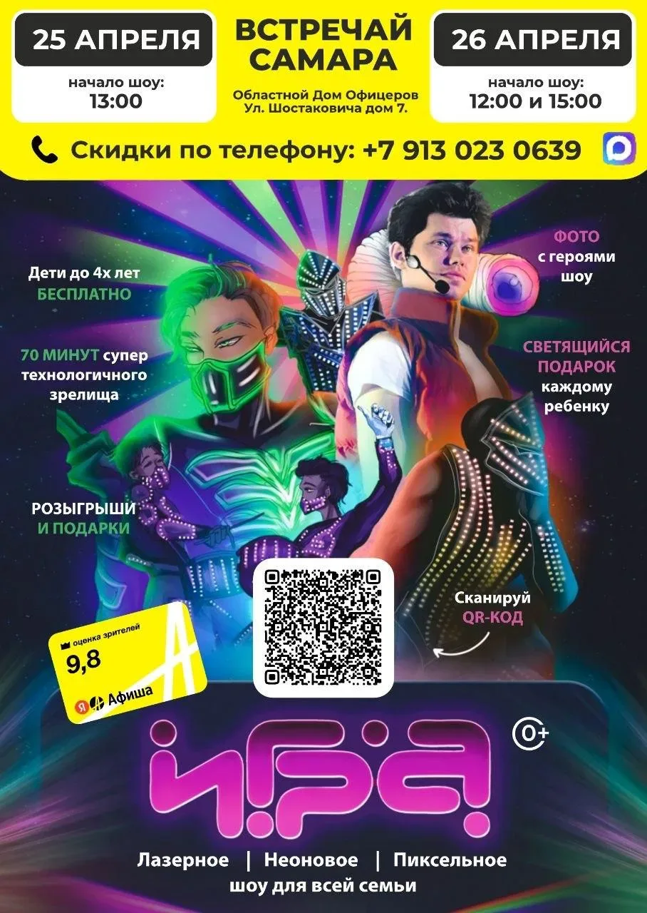 Лазерное/Неоновое/Пиксельное шоу «ИГРА» ⏰25 апреля (сб) в 13:00 26 апреля (вс) в 12:00 и 15:00 📍Окружной Дом Офицеров, ул. Шостаковича, 7 💵Билеты: от 600р. 🔥Скидка 6% при покупке через сайт по промокоду AFS 🎫Билеты по ссылке - https://igra-show.ru/samara/ Крутейшее, технологичное, интерактивное представление! Для детей и взрослых 🥇Оценка зрителей на Яндекс Афише 9,8 Станьте частью ярких событий в мире лазерных лучей, неоновых линий, вспышек пикселей и летающих светящихся шаров! В цену билета в сектор А входит: - светящийся подарок каждому - фотосессия с персонажами шоу - комикс «Накраска» - б…