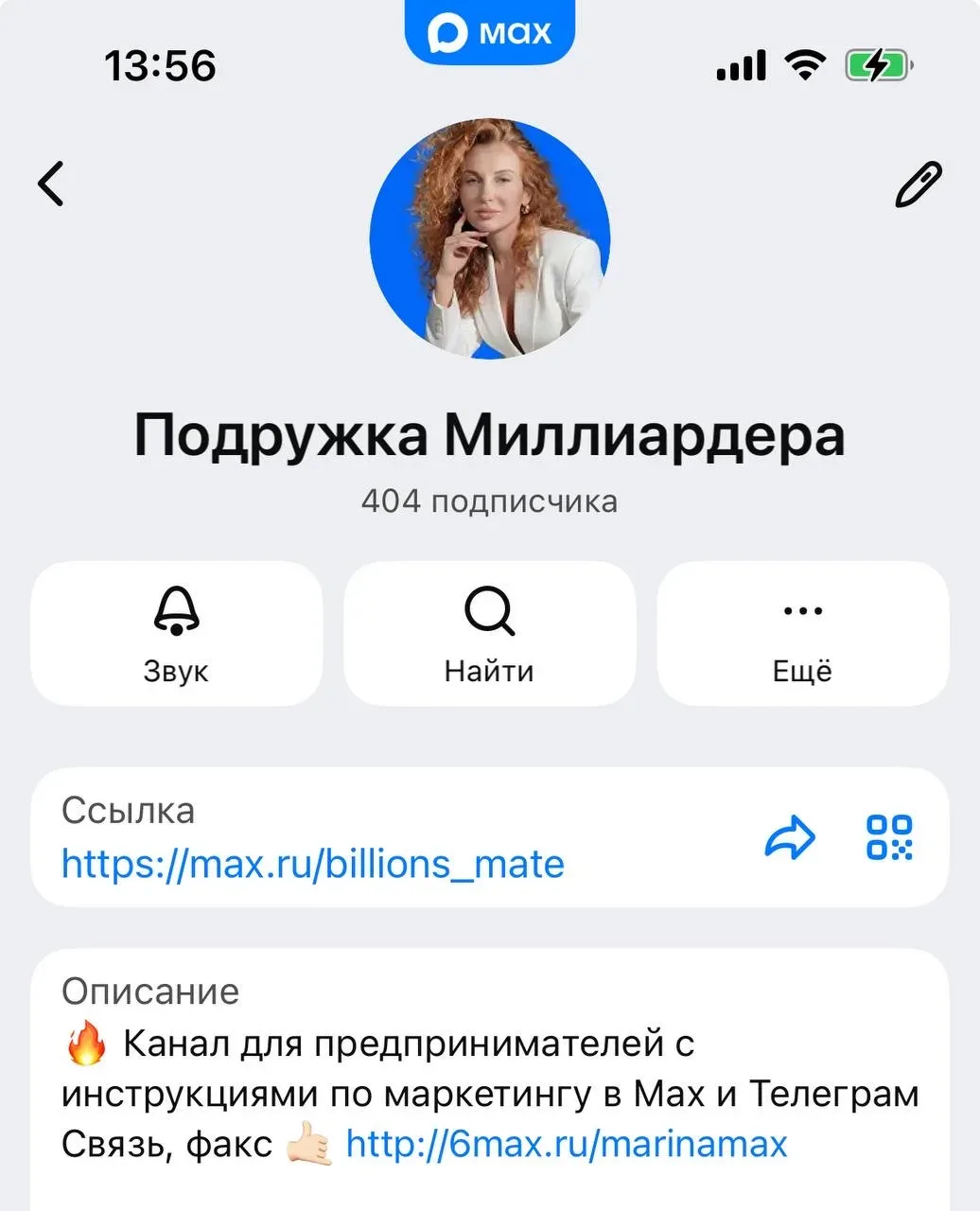 Канал «Подружка Миллиардера» (@billions_mate) позиционирует себя как ресурс для предпринимателей и экспертов, заинтересованных в работе с мессенджером МАХ. Основной фокус сделан на публикацию инструкций, которые помогают освоить функционал платформы. В описании канала указана ссылка на ресурс 6max.ru, где, судя по всему, можно получить более подробную информацию или поддержку, включая возможность связи через факс.