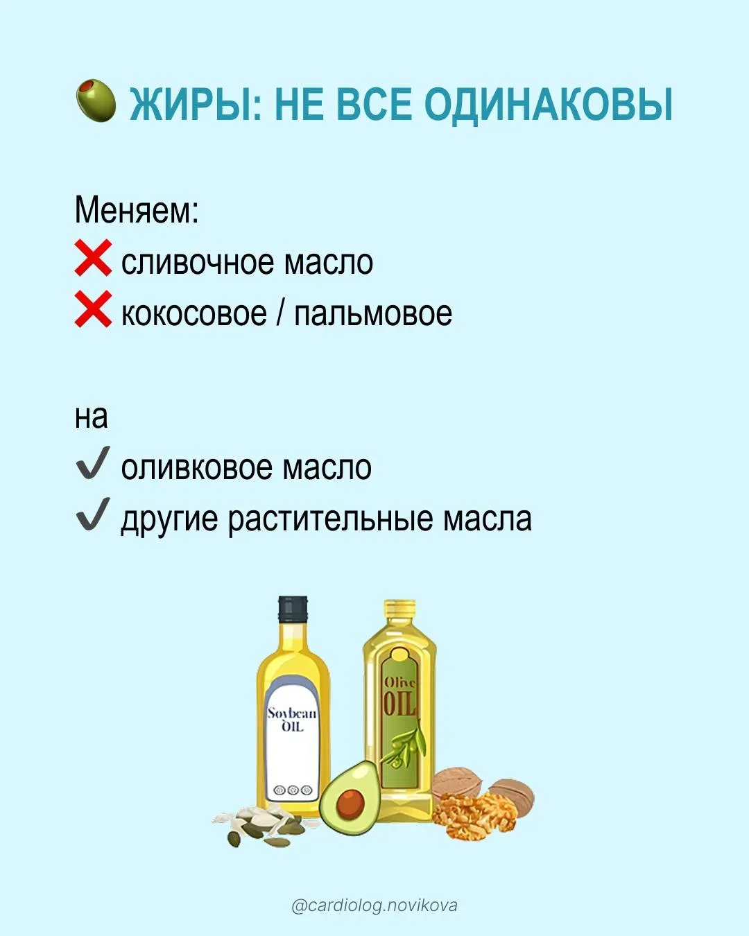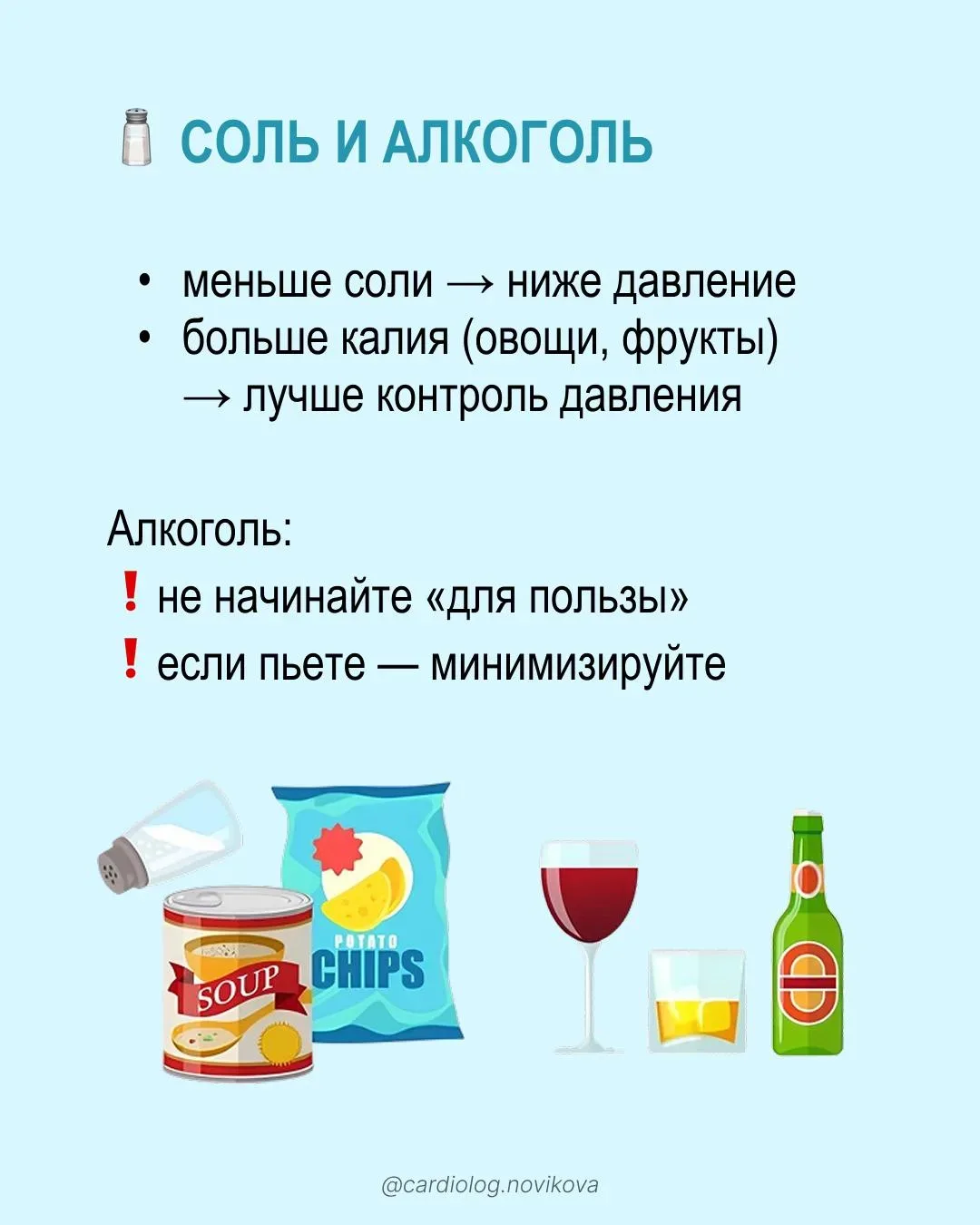 Канал @cardiolognovikova ведёт кардиолог Диана Сергеевна Новикова. Это профессиональный ресурс, посвящённый здоровью сердца и сосудов. Автор, называющая себя «кардиоцаревной», ставит своей задачей донести важные знания, которые помогают сохранить сердечно-сосудистую систему, избегая ненужных трат на сомнительные средства. Основной фокус — практические рекомендации по нормализации артериального давления и уровня холестерина.