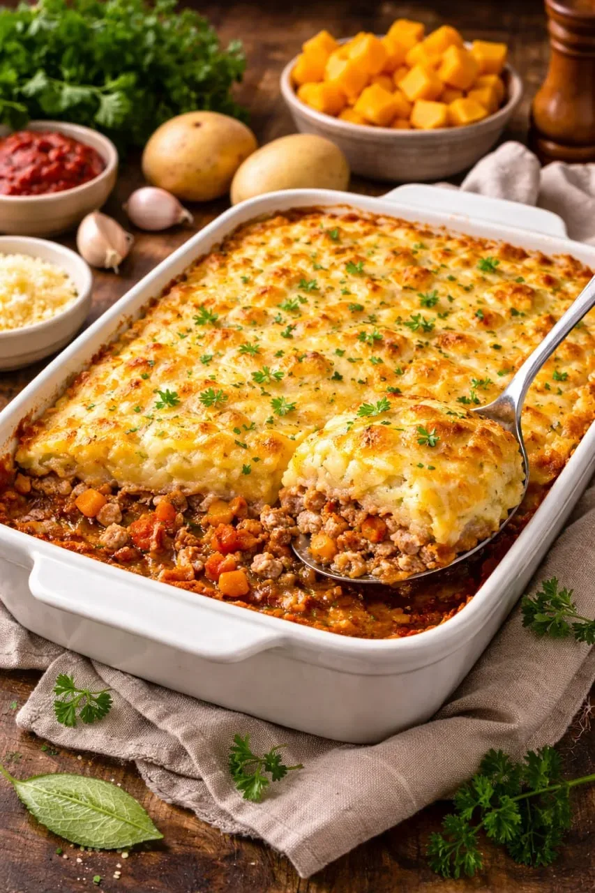Запеканка с картофелем и фаршем Ингредиенты: Оливковое масло 4 ст. л. Фарш свиной 750 г. Лук репчатый 1 шт. Морковь 2 шт. Перец болгарский 1 шт. Лавровый лист 1 шт. Бульон куриный 1 ст. Томатная паста 80 мл. Картофель 750 г Тыква 650 г. Масло слив. 90 г. Приготовление В сковороде разогреть 2 столовой ложки подсолнечного масла. Добавить фарш. Готовить помешивая, на сильном огне минут 10. Переложить фарш на тарелку. Разогреть в сковороде 2 столовой ложки масла. Добавить мелко нарезанный лук, тертую морковь, сладкий перец, нарезанный соломкой. Добавить соль, перец и лавровый лист. Готовить помеш…