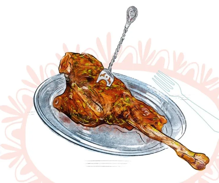 Баранья нога 😨 Приготовление 🍴 8 порций 🕒 2 часа 30 минут Сложность 🌟 Ингредиенты Бараний окорок на кости (весом около 3 кг) 3 веточки свежего розмарина 5 зубчиков чеснока Цедра одного лимона 1 ч.л. молотого черного перца 2 ч.л. соли 3 ст.л. растительного масла 1. Достаньте мясо из холодильника минимум за час до приготовления. Разогрейте духовку до 250°C. Застелите фольгой большой противень. Если вам достался окорок, на котором много жира, его имеет смысл запекать на решетке над противнем, чтобы тающий жир стекал вниз. Жировую прослойку при этом можно надсечь крест-накрест с интервалом 1,5 см…