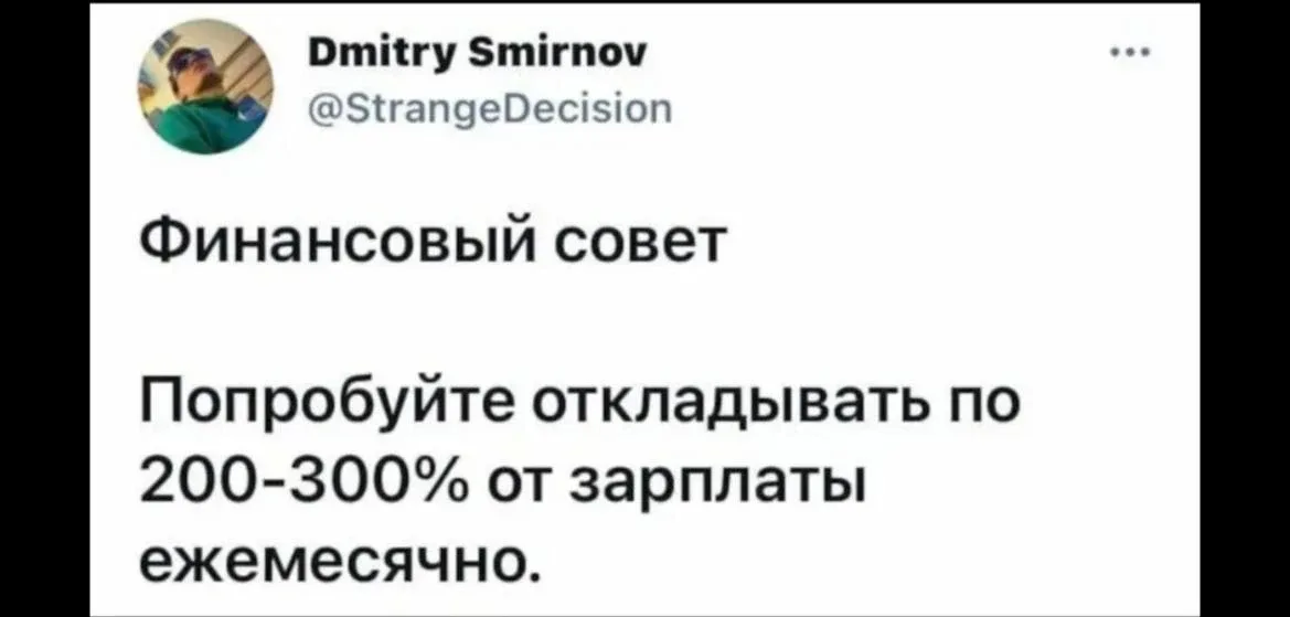 Прочитала такое высказывание и хочу поделиться с вами. Что думаете? Если вы хотите уйти на пенсию с небольшим капиталом, не рассчитывая на госпенсию, то вы не можете позволить себе откладывать по 10%. Забудьте об этой цифре из популярных книг о финансах. Если вы живете в России, вам примерно от 30 до 40, то нужно откладывать от 30 до 50% вашего дохода. Конечно, до 30% нам далеко откладывать. Да и вообще много времени мы вообще ничего не откладывали и начали совсем недавно. Пока ежемесячно делаем так: 10 тыс на ОФЗ 10 тыс в крипту 10 тыс в доллары Не знаю поможет ли это как-нибудь нам на пенси…