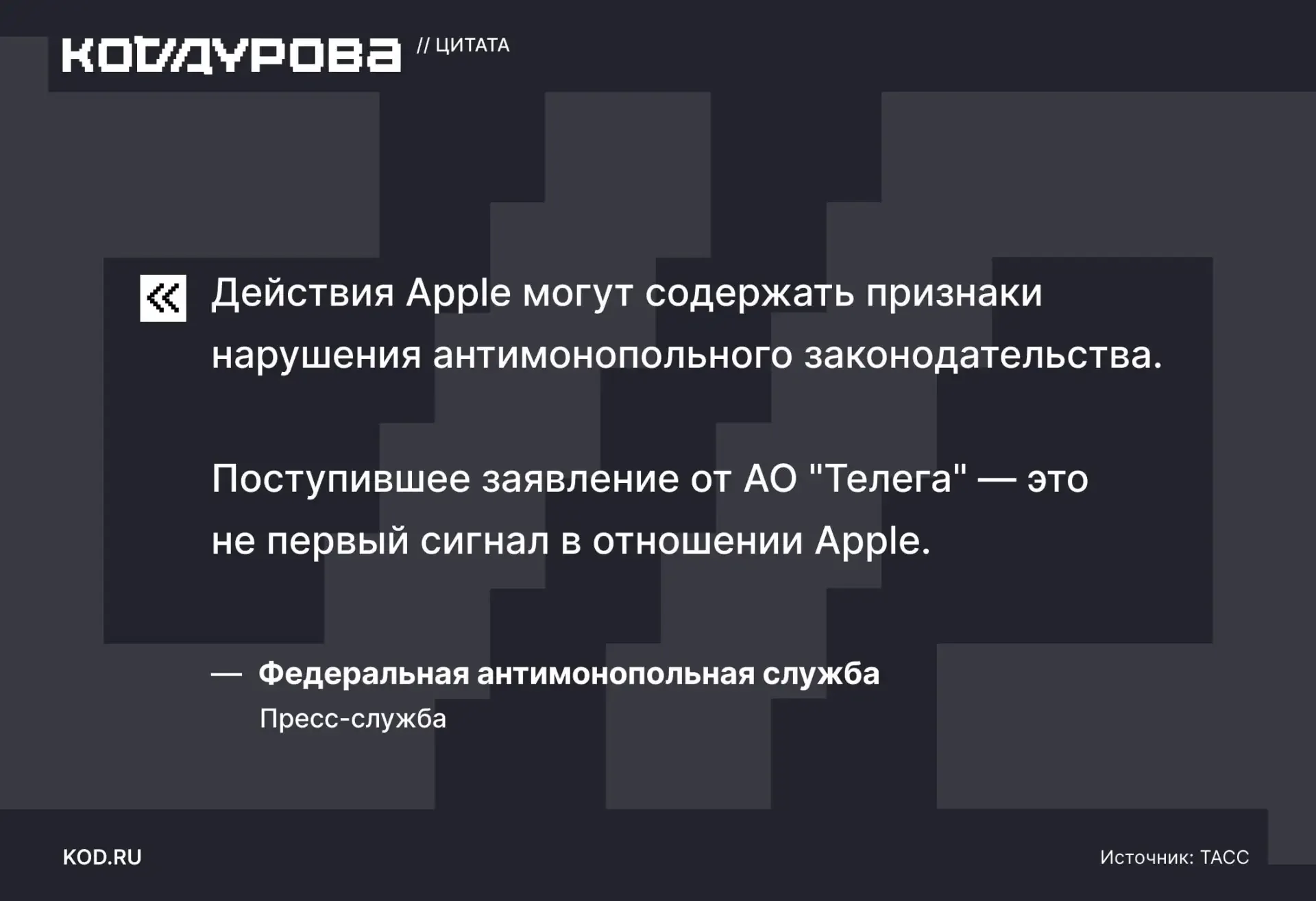⚡️ ФАС на стороне Telega Антимонопольная служба заявила, что Apple действительно может нарушать законодательство. По словам ведомства, «сигналы» в отношении Apple уже поступали. Если закон нарушен, ФАС примет меры. Подробности: ↖️ https://kod.ru/telega-vs-apple Подписаться | KOD.RU