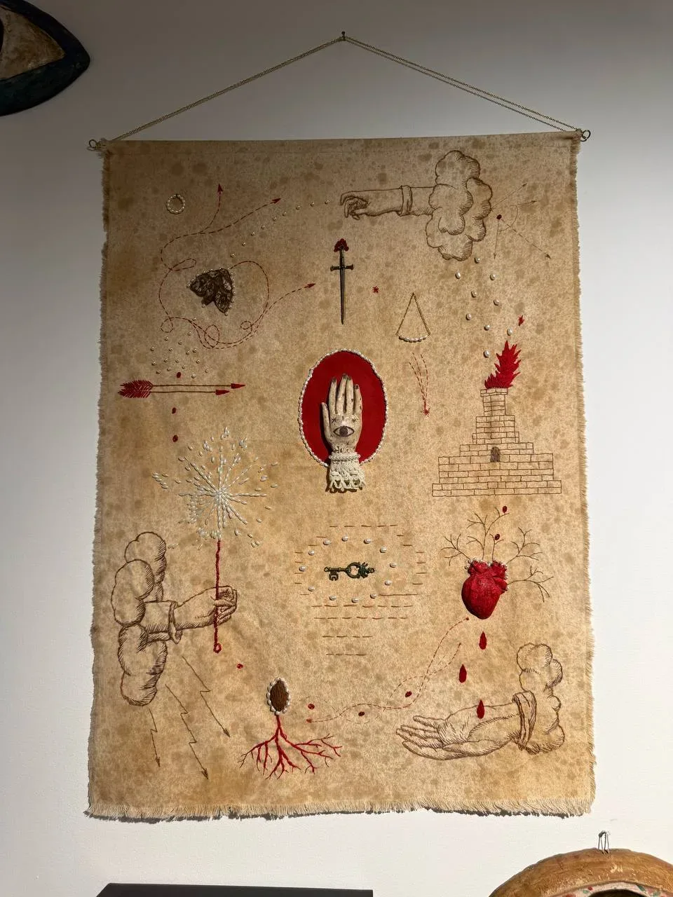 Кстати, вот мой улов с Catalog. Алхимическое полотно из питерской галереи Name gallery. Называется «Карта судьбы». Я свою коллекцию собираю, основываясь на отсылках к любимой литературе. Эта работа сразу всколыхнула воспоминания о «Последней любви в Константинополе» сербского постмодерниста Милорада Павича, одной из лучших книг-лабиринтов. Структура у неё, кстати, как у карт таро, главы можно тасовать. Обязательно почитайте! Ну а вышивка из металла и жемчуга теперь будет красоваться в моём кабинете. Бок о бок с Мамышевым-Монро в кокошнике в исполнении Хлобыстина❤️