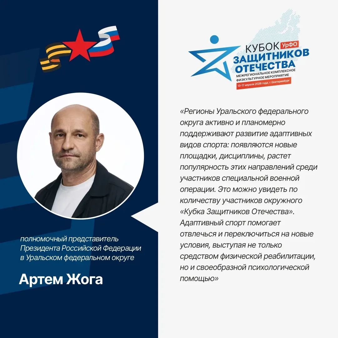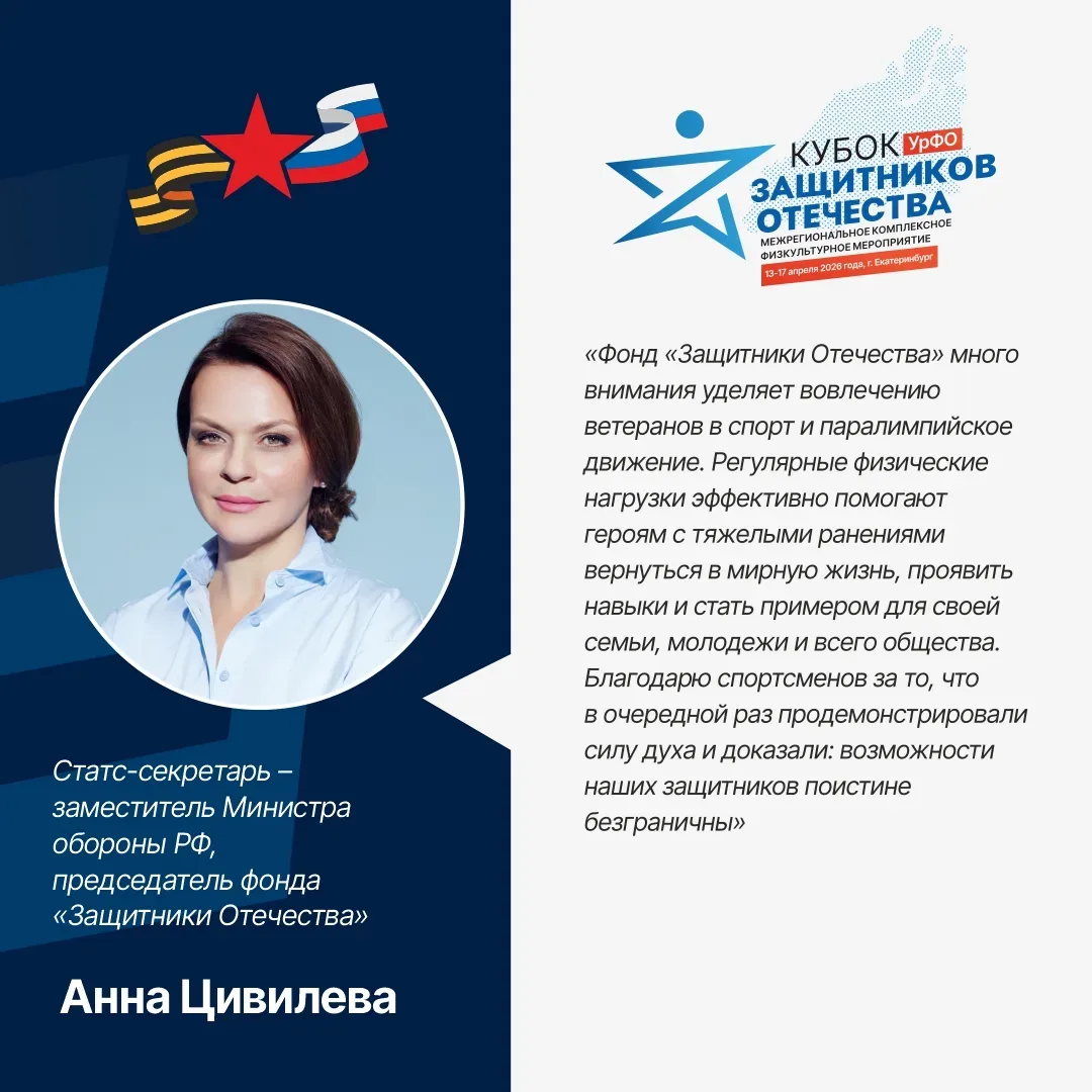 В рамках рабочей поездки в Свердловскую область статс-секретарь – заместитель Министра обороны РФ, председатель фонда «Защитники Отечества» Анна Цивилева провела встречу с полномочным представителем Президента России в Уральском федеральном округе Артемом Жогой. Обсудили вопросы поддержки ветеранов СВО, в частности развитие адаптивного спорта в регионах округа. «Интерес к тренировкам и соревнованиям среди защитников УФО неизменно растет. При содействии аппарата полномочного представителя Президента РФ провели межрегиональный «Кубок Защитников Отечества» и окружной этап конкурса адаптивной оде…