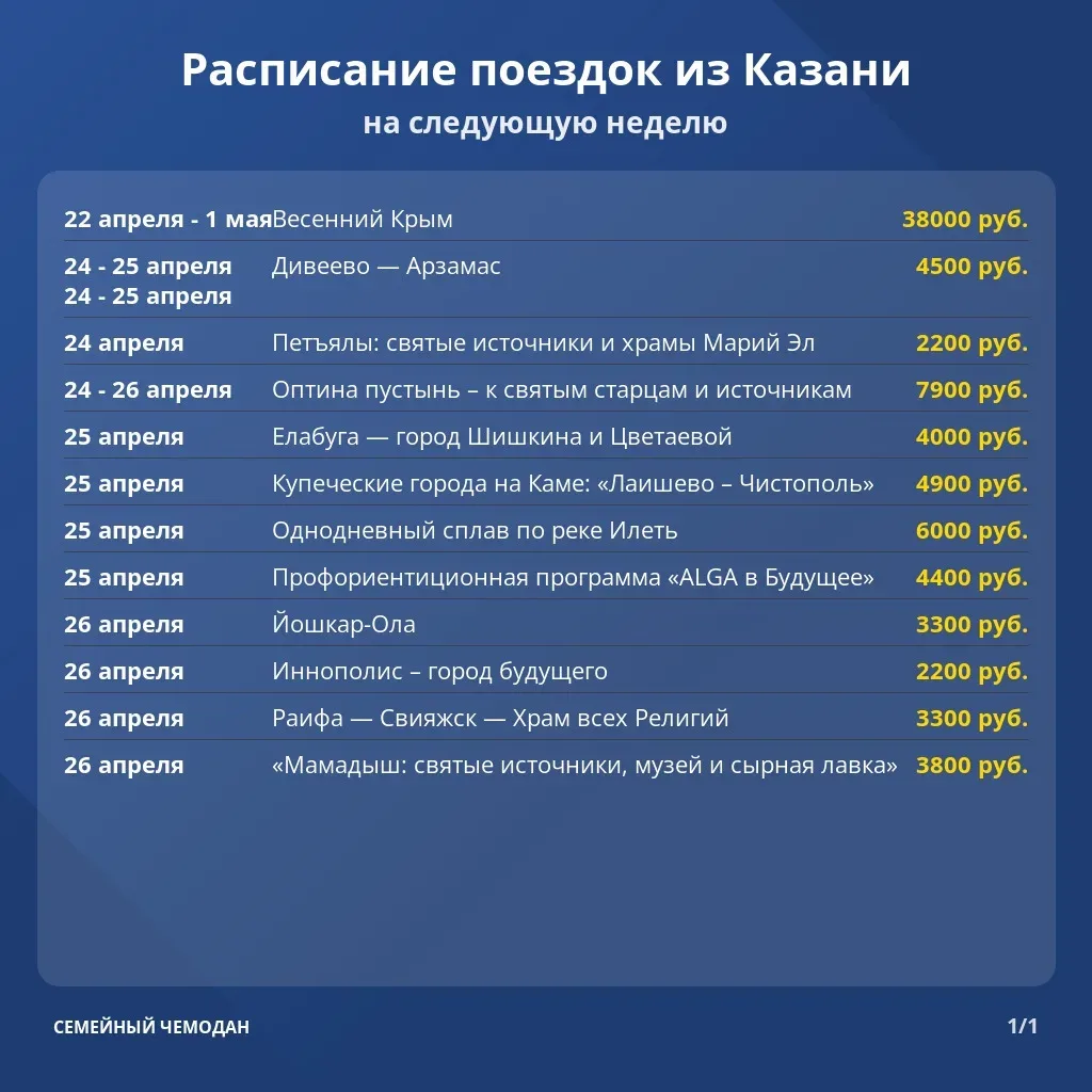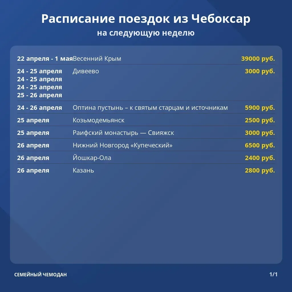 🚍 «Семейный чемодан» — туры по России и СНГ из Казани, Чебоксар и Йошкар-Олы! 🌐 Наш сайт: chemodan-tour.ru 🚍 Автобусные и авиатуры 🏞 Круизы, санатории, экскурсии 🎓 Поездки для школьников 🤝 Приём туристических групп