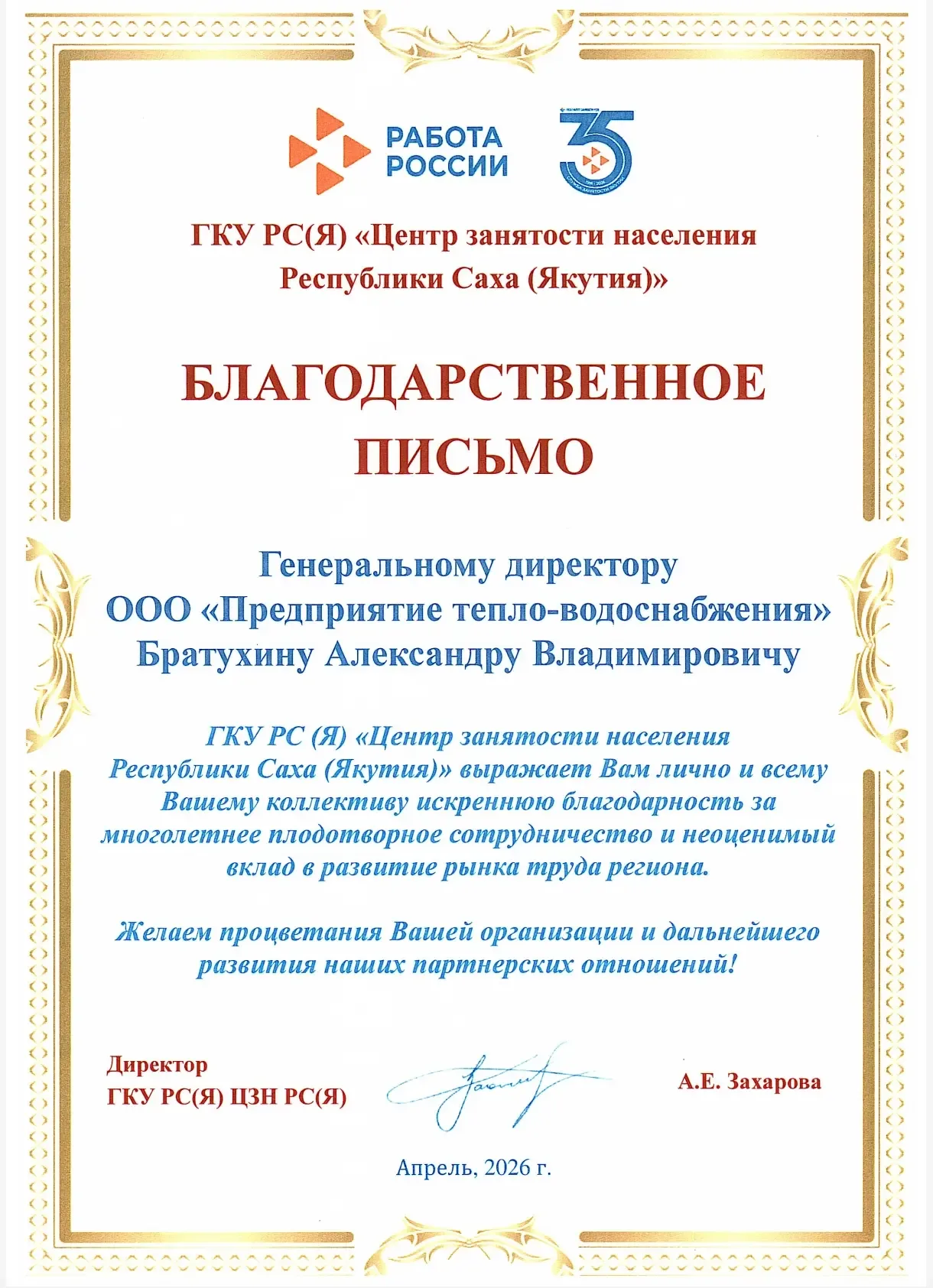 🏆 Благодарность - нашему генеральному директору! Сегодня, в рамках регионального этапа Всероссийской ярмарки трудоустройства «Работа России. Время возможностей» в ДК «Алмаз» (г. Мирный), ГКУ РС(Я) «Центр занятости населения Республики Саха (Якутия)» вручило Благодарственное письмо генеральному директору ООО «Предприятие тепловодоснабжения» Александру Владимировичу Братухину. Это признание - за плодотворное сотрудничество и неоценимый вклад в развитие рынка труда региона. От всего коллектива поздравляем Александра Владимировича с заслуженной наградой! Гордимся, что работаем под руководством та…