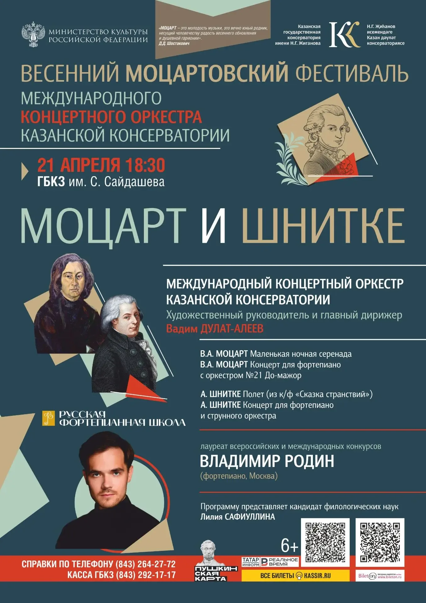 Яркой страницей «Весеннего моцартовского фестиваля Международного концертного оркестра Казанской консерватории» станет концерт «Моцарт и Шнитке». Программа позволит слушателям ощутить как удивительную связь времен, так и их глубокое различие. В исполнении оркестра и московского пианиста Владимира Родина прозвучит музыка «солнечного» Моцарта (Фортепианный концерт № 21 с каденцией Шнитке и «Маленькая ночная серенада») и одного из самых ярких композиторов-психологов XX века Альфреда Шнитке («Полёт» из к/ф «Сказка странствий» и Концерт для фортепиано и струнного оркестра). Владимир Родин — лауреа…