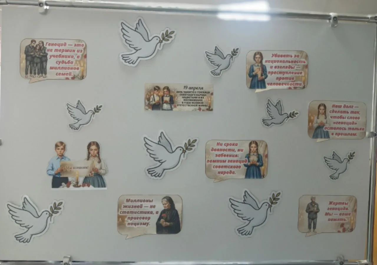 📆 Память, которая объединяет🎗 В нашей школе прошел День памяти жертв геноцида. Старшеклассники совместно с советником директора по воспитанию, оформили информационный стенд, посвящённый трагическим страницам истории. 📜На стенде — не просто даты и факты. Здесь собраны истории людей, цитаты, фотографии и символические образы, которые напоминают: память о невинных жертвах должна жить в каждом из нас. 👧👦Ребята постарались сделать стенд не только информативным, но и трогательным, чтобы каждый, кто проходит мимо, остановился и задумался. Ведь помнить — значит не допустить повторения. Спасибо старше…