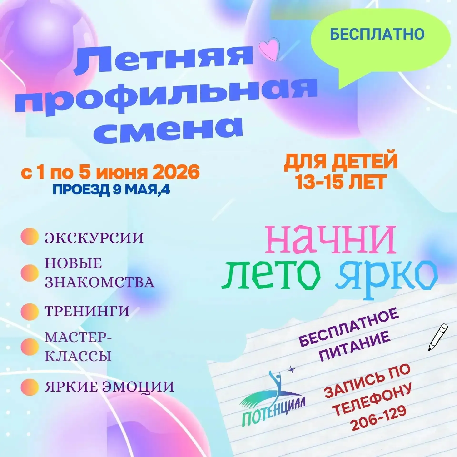 Стартует набор на профильную смену 🚀 Дорогие ребята и уважаемые родители! С 1 по 5 июня 2026 года на базе городского психолого-педагогического центра «Потенциал» пройдет профильная смена для увлеченных школьников. Для кого смена? Для ребят в возрасте от 13 до 15 лет, которые увлекаются олимпиадным движением, хотят углубить знания по школьным предметам и прокачать свои навыки. Что ждет участников? ✅ Мастер-классы от опытных педагогов и приглашенных специалистов; ✅ Экскурсии в ведущие учебные заведения города Барнаула; ✅ Проектная работа и тренинги; ✅ Интерактивные игры, квесты и командные соре…