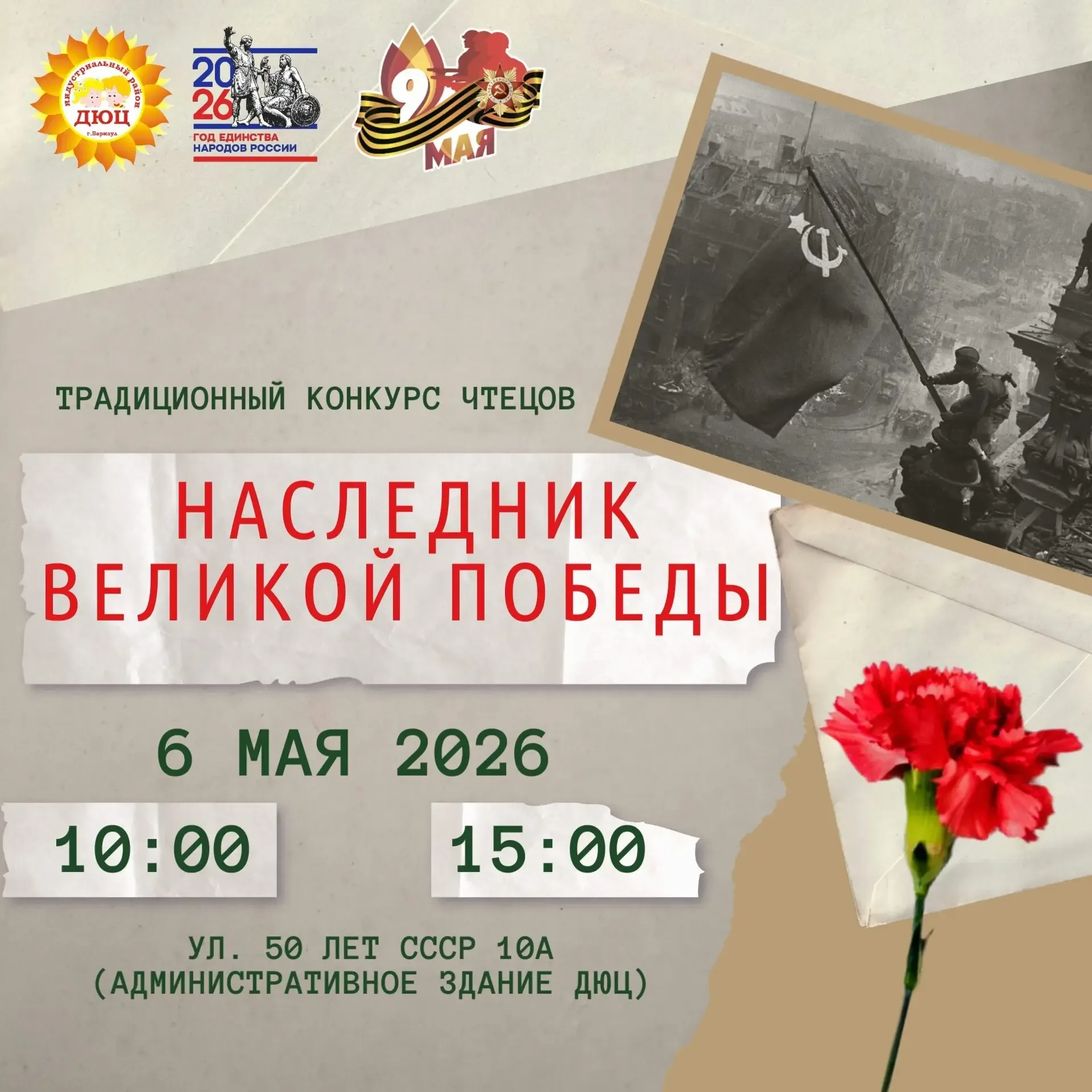 Голосом сквозь время. Стань «Наследником Великой Победы»! 🔥 81 год отделяет нас от победного мая 1945-го. Меняются поколения, но не меркнет гордость за подвиг дедов и прадедов. Детско-юношеский центр приглашает ребят, родителей и педагогов принять участие в нашем традиционном конкурсе чтецов «Наследник Великой Победы». 🎤 Что нужно сделать? Прочитать отрывок прозы или стихотворение о Великой Отечественной войне. Ваше выступление не должно превышать 4 минут. 📅 Главные даты: ❗ До 28 апреля (включительно) — принимаем заявки. ⏰ 6 мая — конкурсный просмотр в 10:00 или 15:00 (выберите удобный вариан…