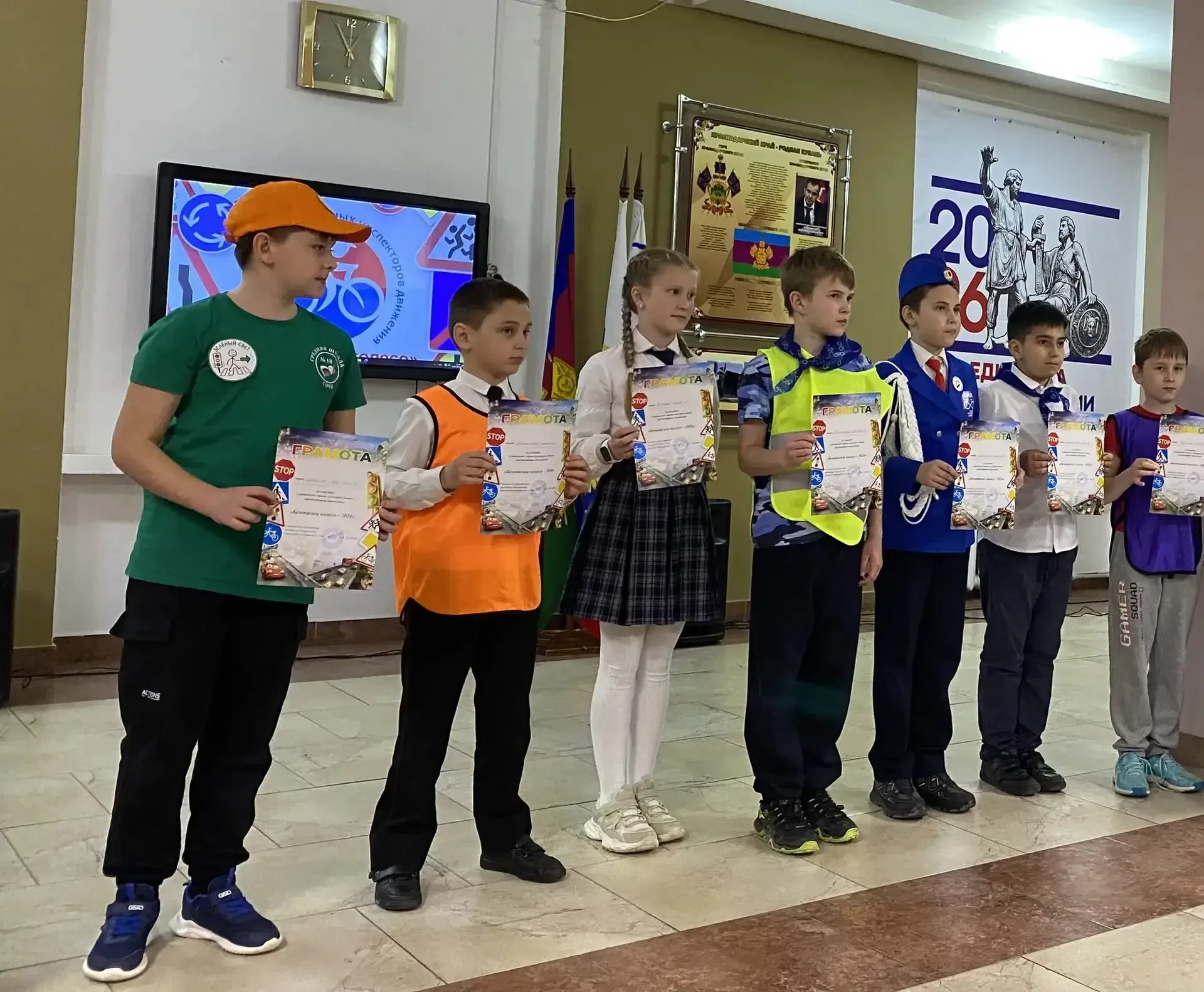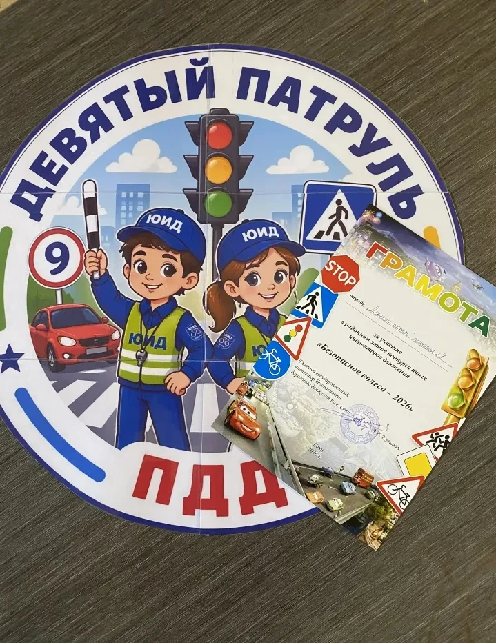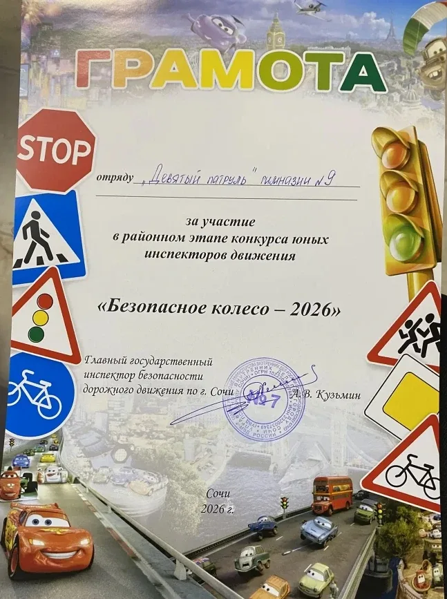 24 апреля на базе МОБУ Лицея №3 города Сочи имени Героя Советского Союза Стогова Н. И. состоялся муниципальный этап конкурса юных инспекторов движения «Безопасное колесо — 2026», приуроченный к 90-й годовщине образования Госавтоинспекции. От МОБУ Гимназии №9 города Сочи имени Н. Островского (1 корпус) на конкурс была направлена команда юных инспекторов из 3 «В» класса, классный руководитель — Симонова Алена Александровна. В команду вошли: - Лисоченко Ярослав - Ивкин Илья - Симакова Мария - Острикова Екатерина Программа конкурса включала: - приветствие (название команды, девиз, презентацию); -…