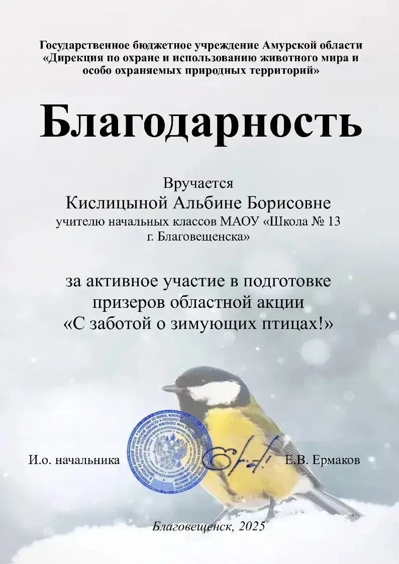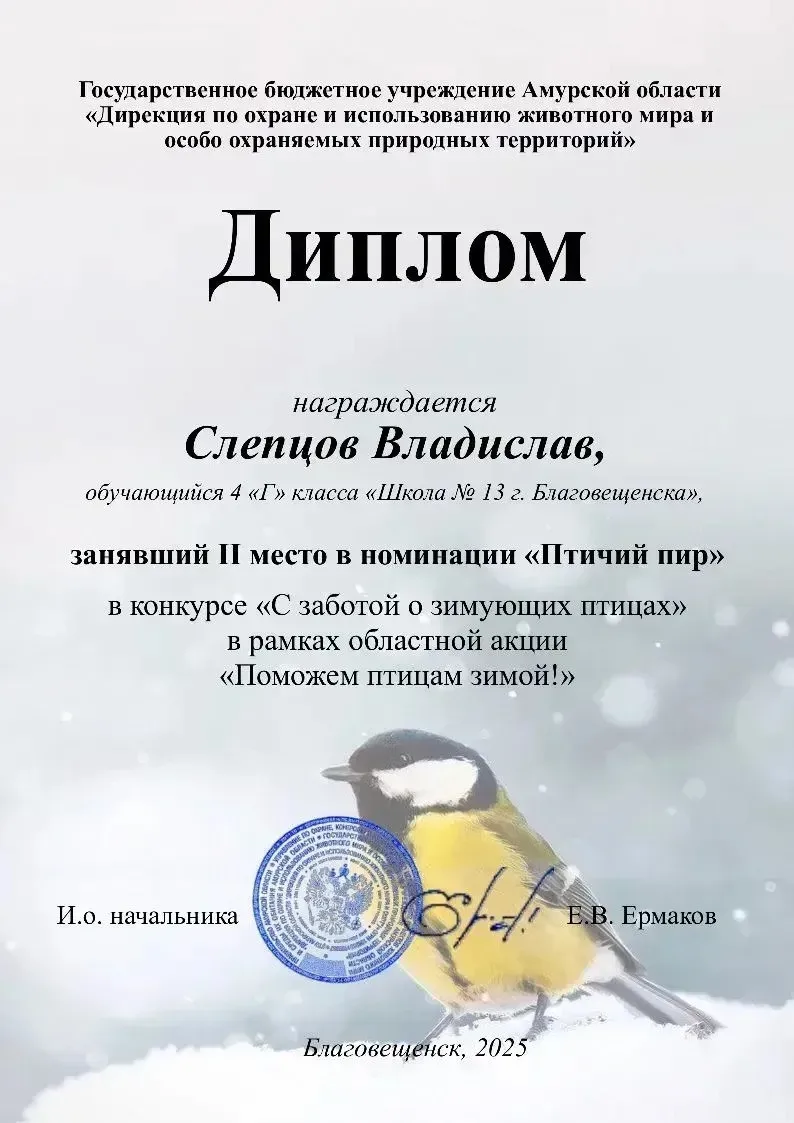 Ученик 4 «Г» класса школы Слепцов Владислав стал призером областного конкурса «С заботой о зимующих птицах». Владислав занял почетное II место в номинации «Птичий пир». Конкурс проводился в рамках масштабной акции «Поможем птицам зимой!». Забота о тех, кто нуждается в нашей помощи в холодное время года — это признак доброго сердца и ответственности. Учитель начальных классов Кислицына Альбина Борисовна отмечена благодарностью за активное участие в подготовке призеров областной акции «С заботой о зимующих птицах!»🦅🐥🦉