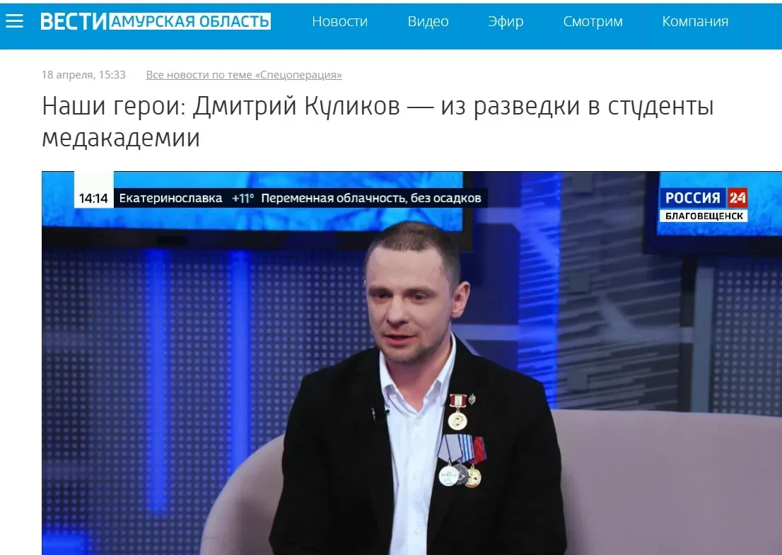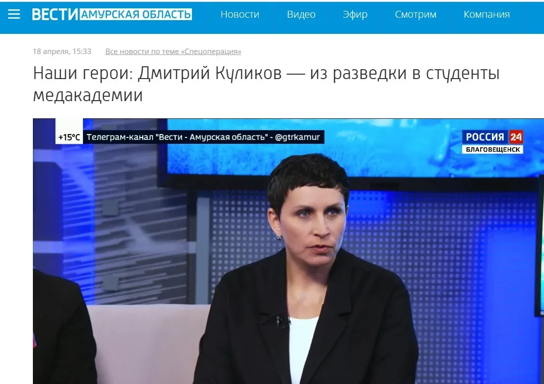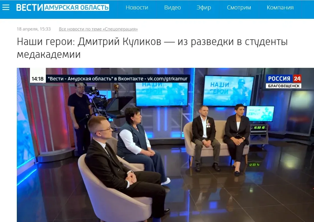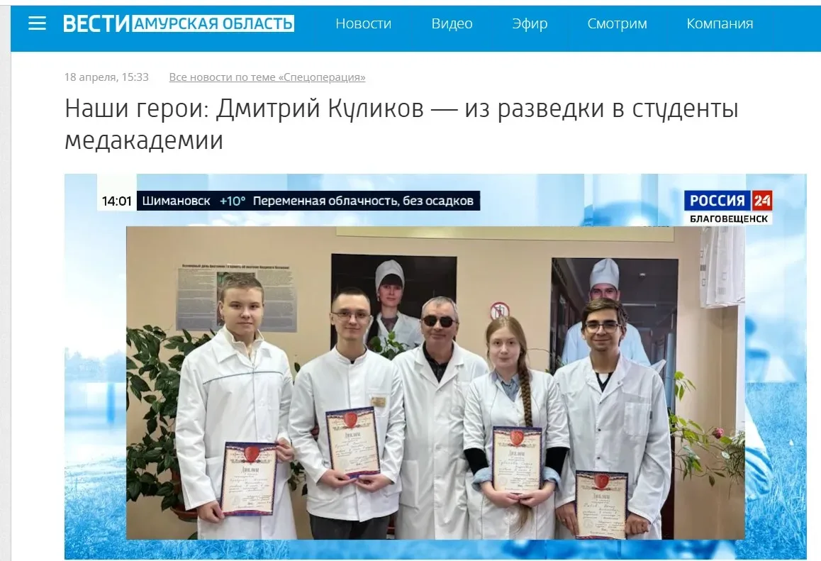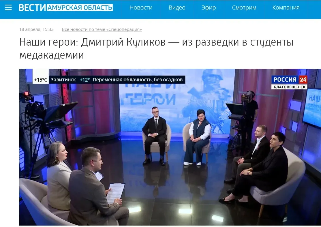 Наши на экране На телеканале ГТРК Амур вышла в эфир программа НАШИ ГЕРОИ, посвящённая студенту Амурской ГМА Дмитрию Куликову Напомним, в съёмках программы приняли участие и. о. ректора Амурской ГМА Ирина Валентиновна Жуковец, заместитель декана лечебного факультета четвёртого курса, ветеран СВО Александр Александрович Агарков. Запись передачи доступна по ссылке