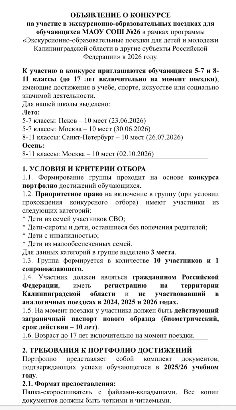 Канал МАОУ СОШ №26 г.Калининград (username: @id3907013279_gos) создан для оперативного информирования учеников, родителей и учителей. Здесь публикуются официальные объявления, новости о школьных мероприятиях, изменения в расписании и важные напоминания.