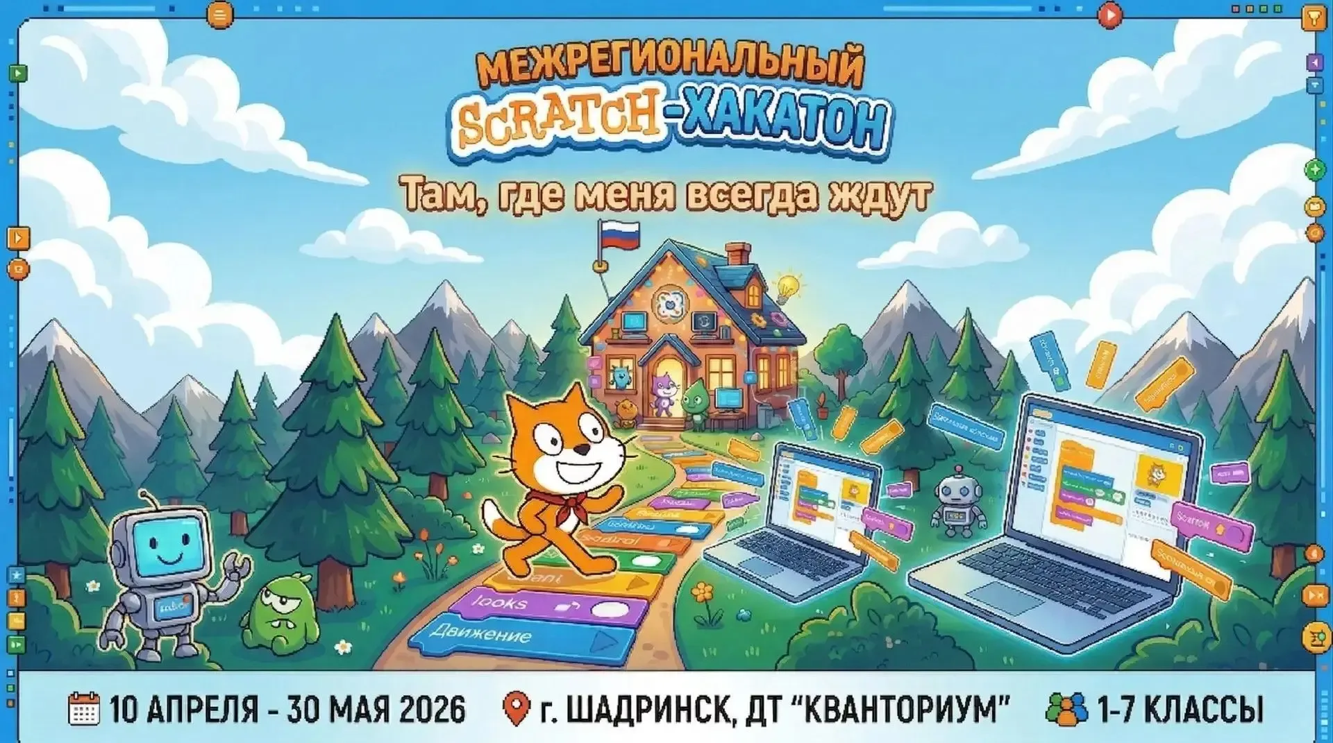🛑Департамент образования и науки Курганской области информирует о проведении межрегионального Scratch-хакатона «Там, где меня всегда ждут» в рамках ИТ-феста «Курганская область – территория возможностей». 💥Хакатон проводится дистанционно. Организаторы - ГАНОУ КО «ЦРСК» (Детский технопарк «Кванториум» (г.Шадринск)) и ФГБОУВО «Шадринский государственный педагогический университет. 💯К участию в Хакатоне приглашаются обучающиеся в возрасте от 7 до 14 лет. Направления Хакатона: - мультфильмы, - компьютерные игры, выполненные на языке программирования Scratch. Заявка для участия в Хакатоне заполня…