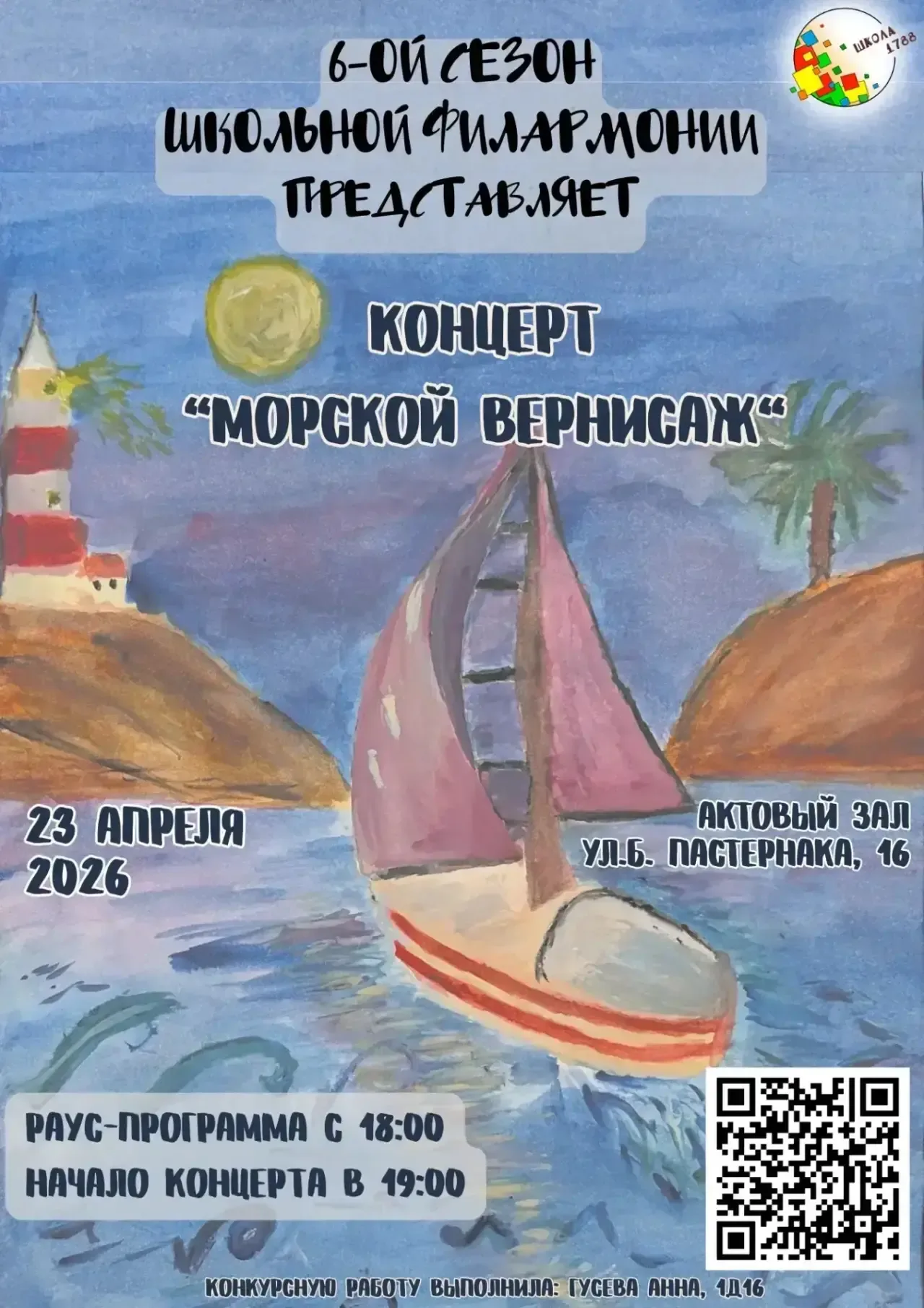 🐚 УЖЕ ЗАВТРА! 🐚 💕 Дорогие друзья! С нетерпением ждем вас на концерте Школьной филармонии 1788 — «Морской вернисаж»! 🌊 Завтра, 23 апреля, в 18:00 — открываем настоящую картинную галерею с ожившими шедеврами! ✨ В 19:00 — главный концерт Школьной филармонии!✨ 📍 ул. Бориса Пастернака, 16, Актовый зал 👗 Наряжаемся в оттенки моря, неба и жемчуга (синий, бирюза, белый, песочный, коралловый). Морские аксессуары — только приветствуются! 🎟 Регистрация ещё открыта: https://forms.yandex.ru/u/69dcd491eb6146ae3e26db1e/ Приходите — будет атмосферно, ярко и по‑морскому элегантно! 🐠 #ШкольнаяФилармония1788 #в…