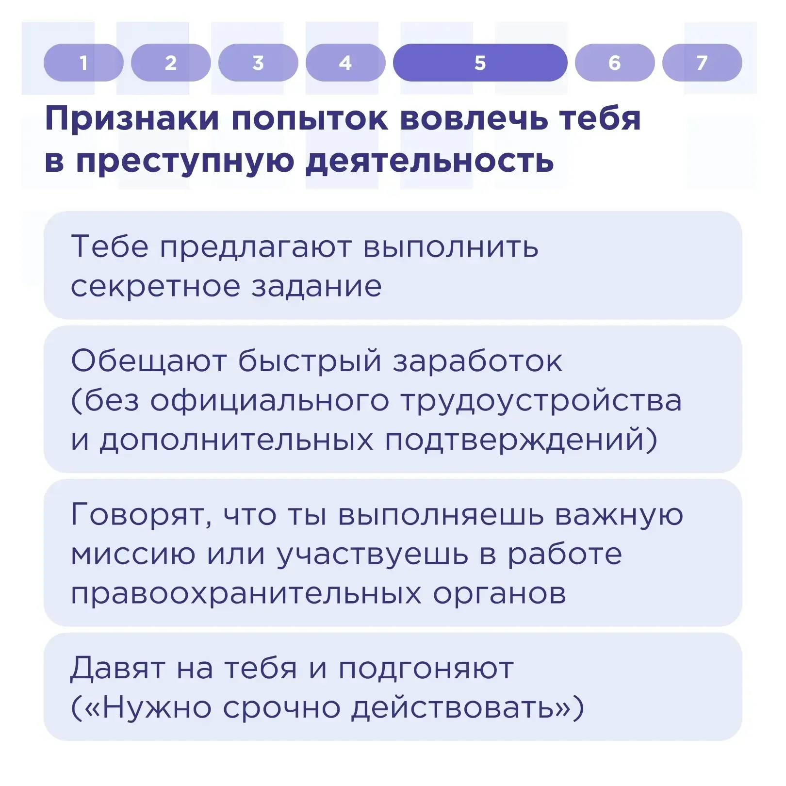 Как не стать жертвой мошенников и пособником преступников Злоумышленники всё чаще охотятся на подростков в интернете. Их цель — ваши деньги, личные данные или вовлечение в преступные схемы под видом лёгкого заработка. 🚩 Тебя точно обманывают, если запугивают в сообщениях, обещают призы за просмотр видео или требуют данные банковской карты прямо в игре. Это классические уловки мошенников. Отдельная опасность — попытки сделать тебя пособником. Тебе предлагают «секретное задание», обещают быстрый заработок без оформления, говорят что ты участвуешь в важной миссии и подгоняют фразой «нужно срочно…