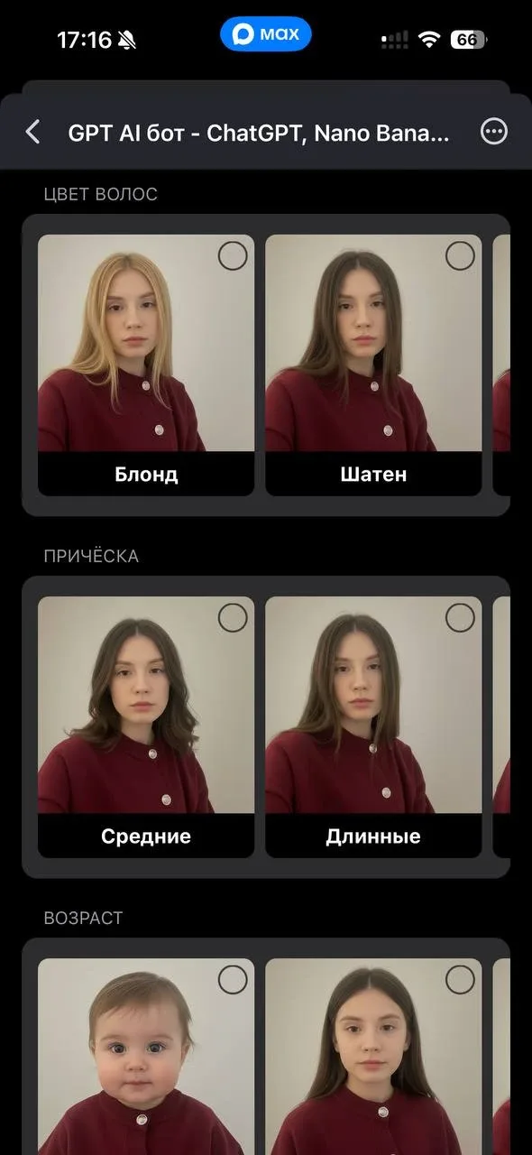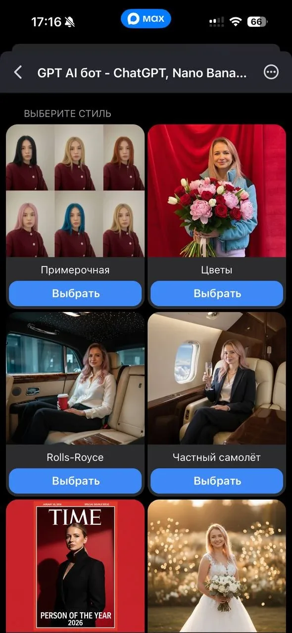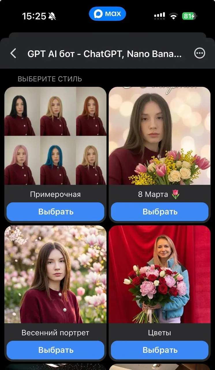 Chat GPT (чатгпт, ЧатГПТ) — бесплатный AI бот и ИИ помощник в MAX. Нано банана (Nano Banana 2, Pro), GPT Image — генерация и обработка фото, фотосессия, аватар, фотошоп. Veo 3.1 — генерация видео. Дипсик, Клод, Джемини,…