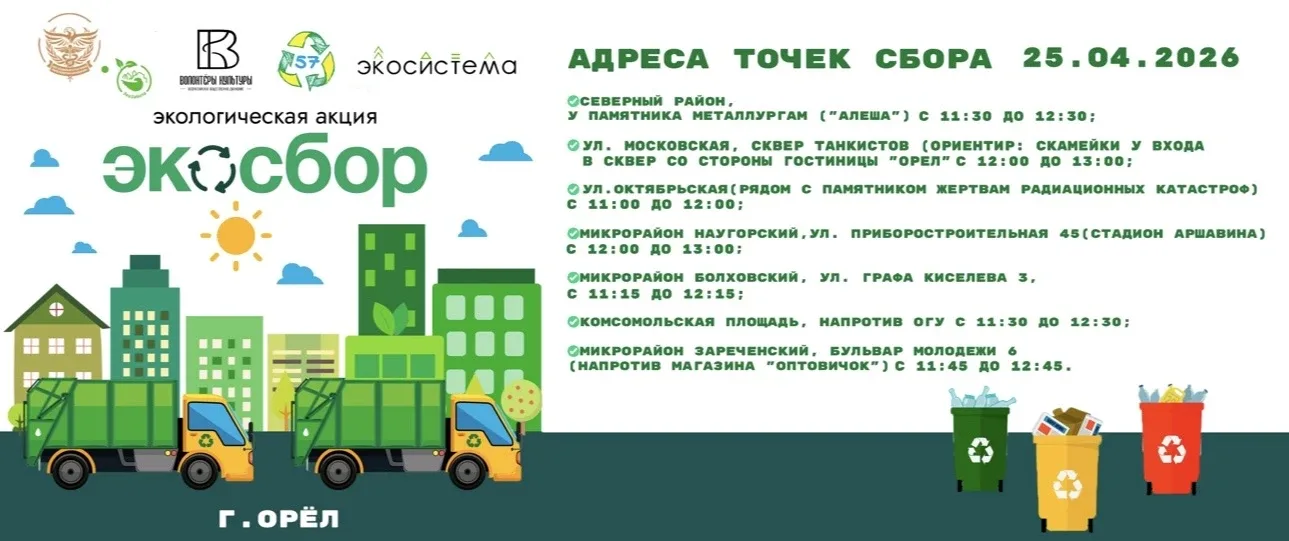 ♻️ Орловчан приглашают на экологическую акцию «ЭкоСбор» В эту субботу, 25 апреля, в Орле пройдет акция по раздельному сбору отходов. Это отличный повод сделать город чище и поддержать тех, кому нужна помощь. Что можно сдать на переработку: ▫️макулатуру, ▫️пластиковые бутылки (PET), ▫️флаконы и канистры (HDPE), ▫️крышки от бутылок, ▫️упаковочную пленку и пакеты. 📍 Пункты приема будут работать в разных районах города — вы легко найдете ближайший к дому. Все адреса и время работы смотрите в карточке. За участие можно получить бонусы от «ВкусВилл», а все вырученные средства направят на благотвори…
