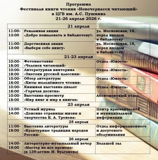Уважаемые новочеркасцы! 📚 В Пушкинской библиотеке с 21 по 26 апреля пройдет фестиваль книги и чтения «Новочеркасск читающий». ❗️С программой мероприятий вы можете ознакомиться в нашей афише. #АдминистрацияНовочеркасска #Новочеркасск