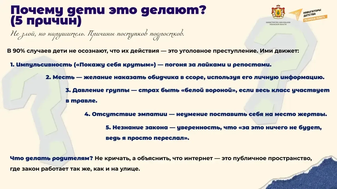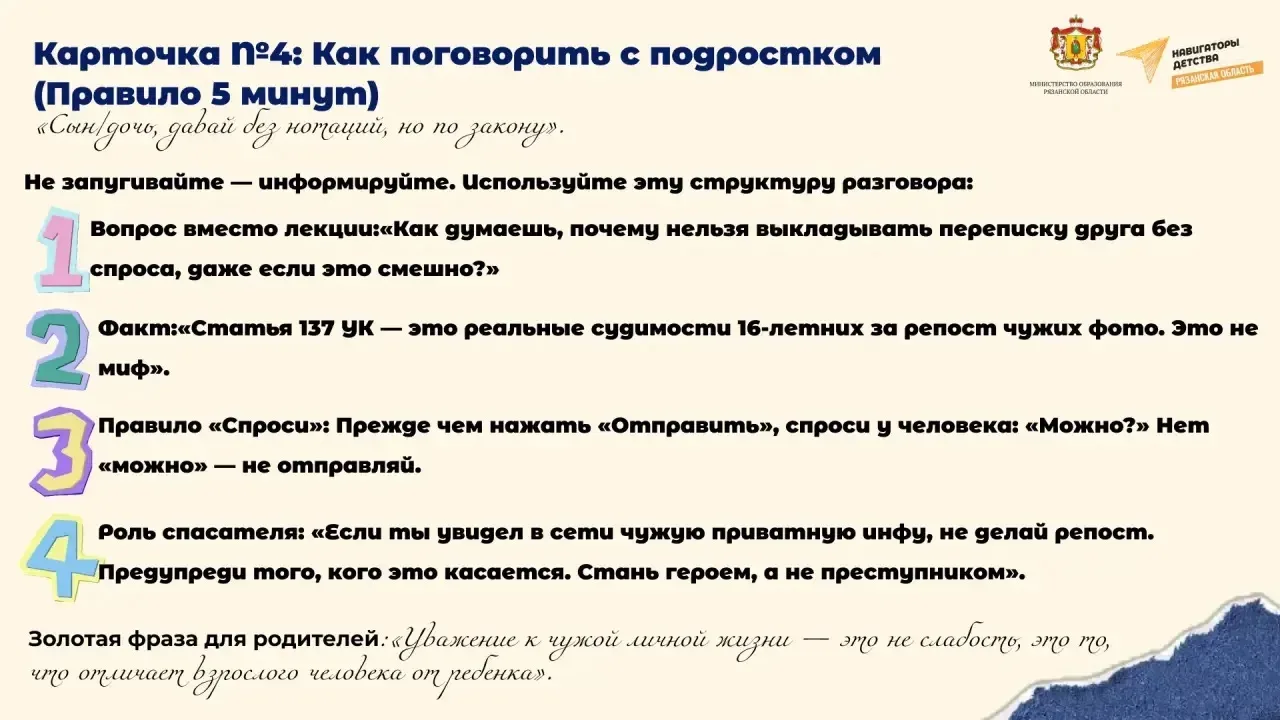 Родители, внимание: что нужно знать о ст. 137 УК РФ и безопасности детей в сети 📲 Дети активно пользуются соцсетями: делятся фото, видео, шутят и общаются. Но иногда они могут невольно нарушить закон или стать жертвой. Статья 137 УК РФ предусматривает ответственность за незаконное распространение сведений о частной жизни человека без его согласия. Это касается личных фото и видео, скриншотов личной переписки, данных о месте учебы, проживания и любых сведений, которые человек хотел оставить приватными. ❗ Наказание суровое: от штрафа до лишения свободы. ➡ Разберемся, что такое ст. 137 УК РФ, ка…