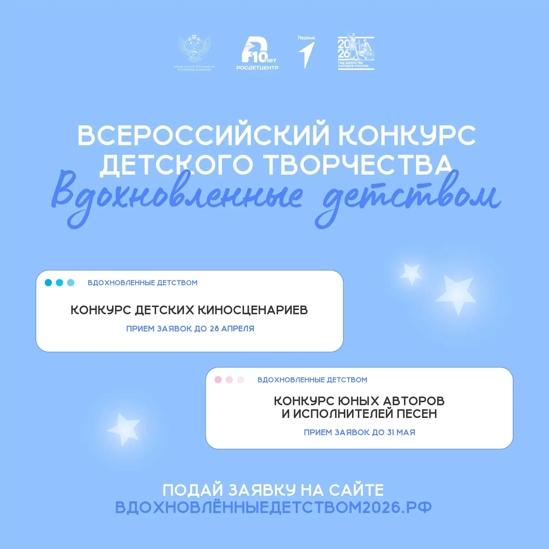 Твои идеи созданы для экрана и сцены. Действуй! Стартовал приём заявок на Всероссийский конкурс детского творчества «Вдохновленные детством». В этом году возможностей стало вдвое больше: 🔊Всероссийский конкурс детских киносценариев Номинации: - фантастика (образы будущего страны); - история (прошлое страны); - драма (взаимоотношения людей и социальные темы); - комедия-приключения. Участниками каждой из номинаций станут обучающиеся в возрасте: - 7–11 лет (совместно с родителями); - 12–14 лет; - 15–17 лет. Приём заявок продлится до 28 апреля. 🔊Всероссийский конкурс юных авторов и исполнителей п…