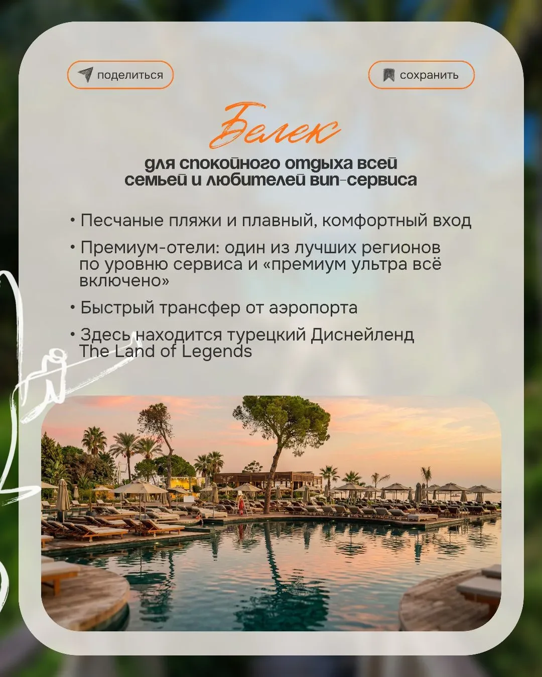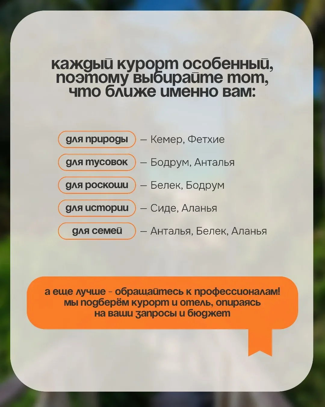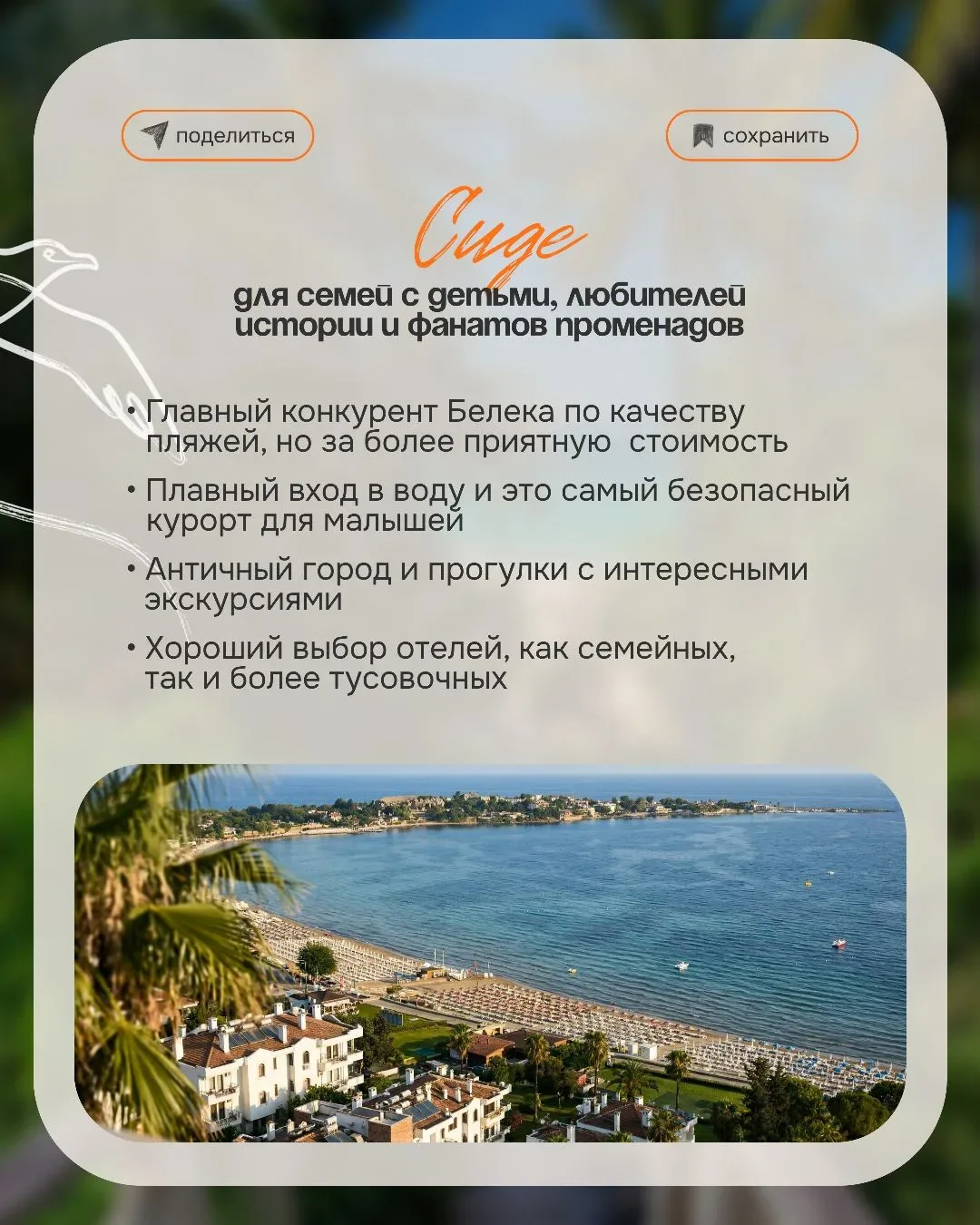 Выбрать курорт в Турции иногда сложнее, чем кажется 😅 Потому что одна и та же поездка может ощущаться совершенно по-разному — где-то вы просто отдыхаете и никуда не хочется выходить — а где-то каждый вечер тянет гулять, смотреть, пробовать новое И вроде страна одна… а ощущения — как будто вы в разных местах И вот здесь чаще всего происходит разочарование 👇🏻 когда выбирают «по совету» или «как у друзей» а потом ловят себя на мысли «ожидала совсем другое…» ✨️ Почему так? Потому что упускают важные детали: — расстояние от аэропорта — формат пляжа — атмосфера курорта — климат в конкретный месяц А…