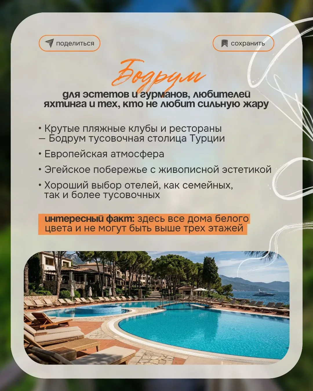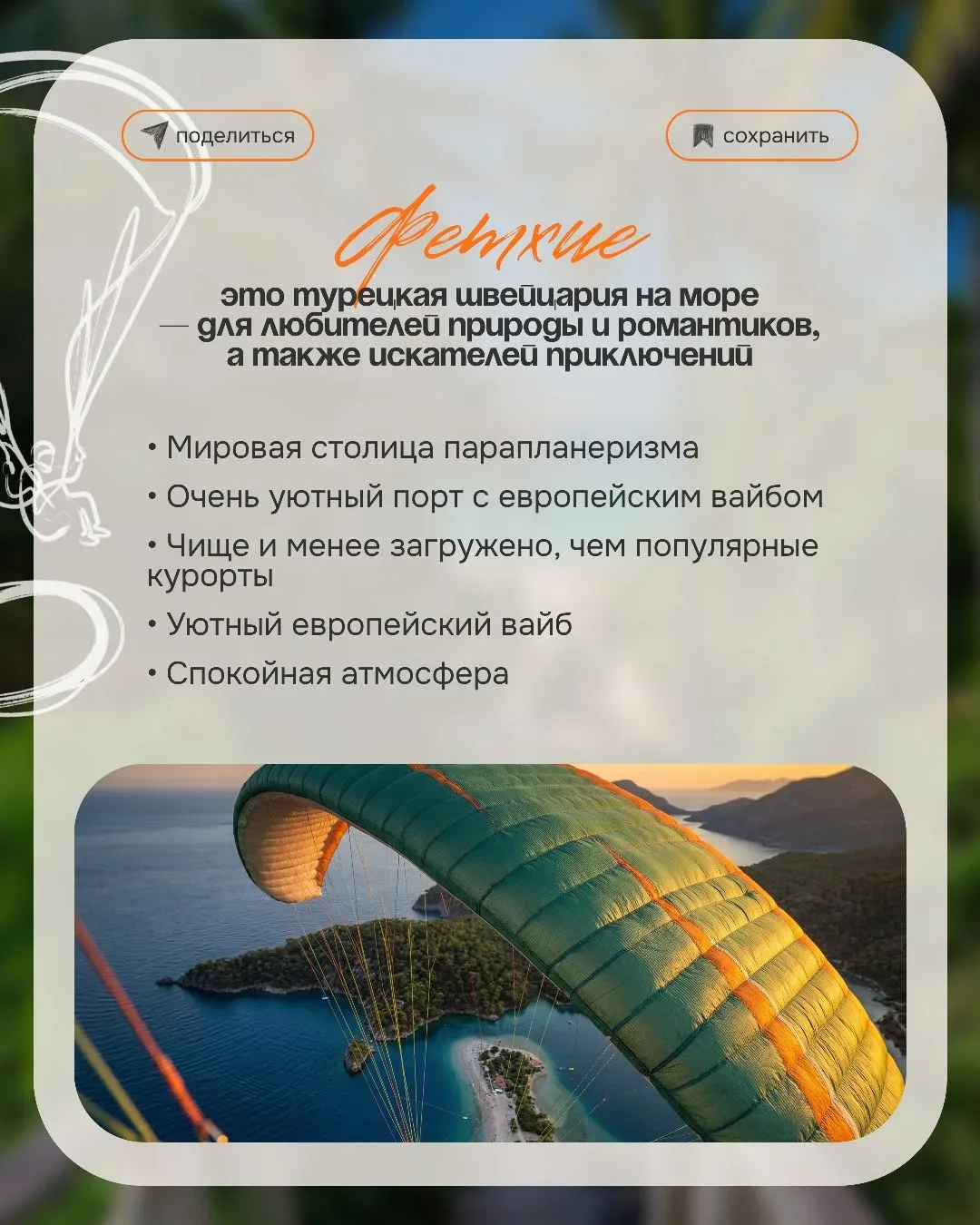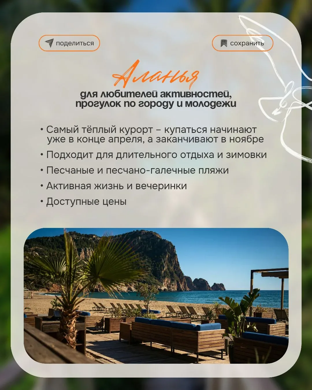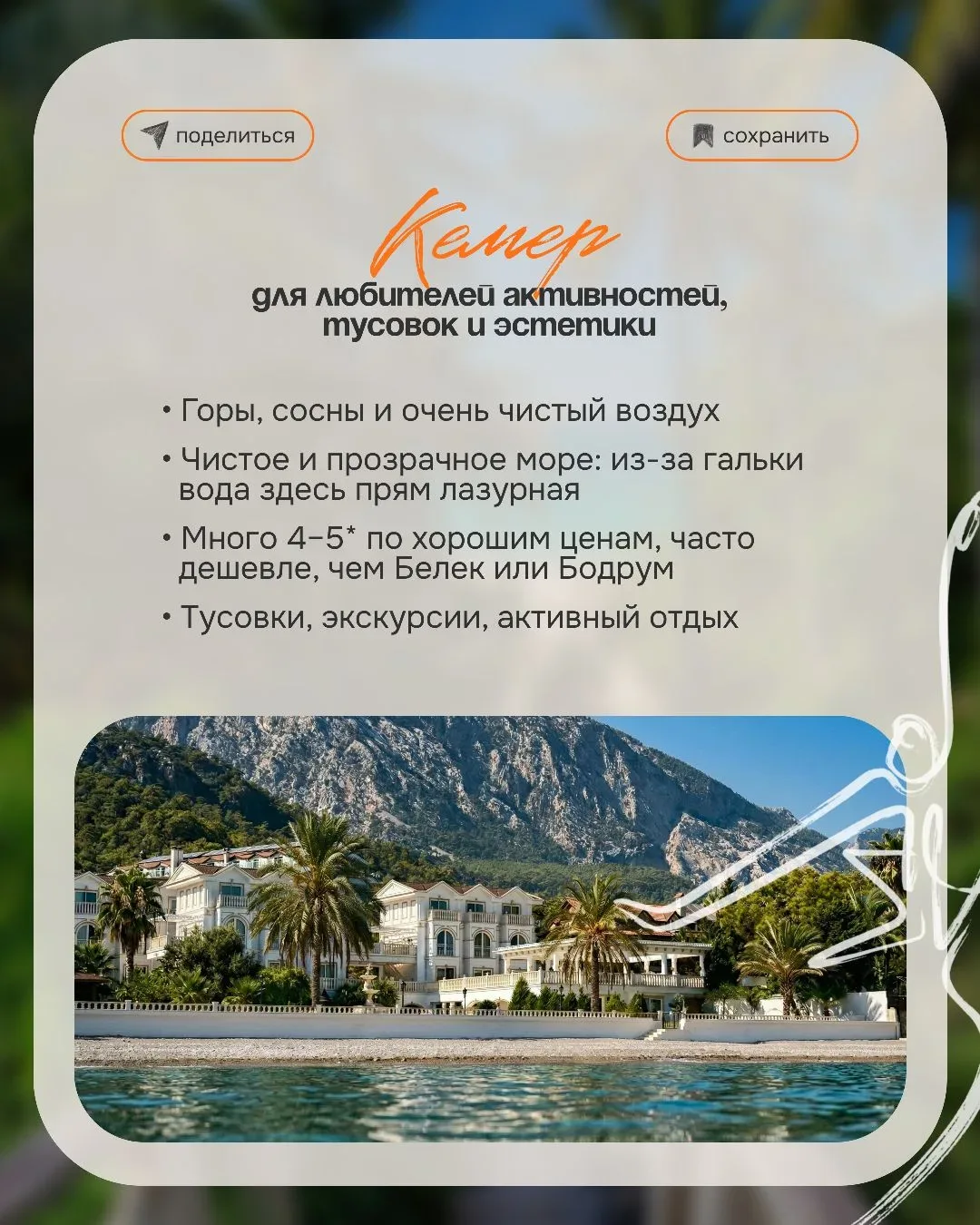 Выбрать курорт в Турции иногда сложнее, чем кажется 😅 Потому что одна и та же поездка может ощущаться совершенно по-разному — где-то вы просто отдыхаете и никуда не хочется выходить — а где-то каждый вечер тянет гулять, смотреть, пробовать новое И вроде страна одна… а ощущения — как будто вы в разных местах И вот здесь чаще всего происходит разочарование 👇🏻 когда выбирают «по совету» или «как у друзей» а потом ловят себя на мысли «ожидала совсем другое…» ✨️ Почему так? Потому что упускают важные детали: — расстояние от аэропорта — формат пляжа — атмосфера курорта — климат в конкретный месяц А…