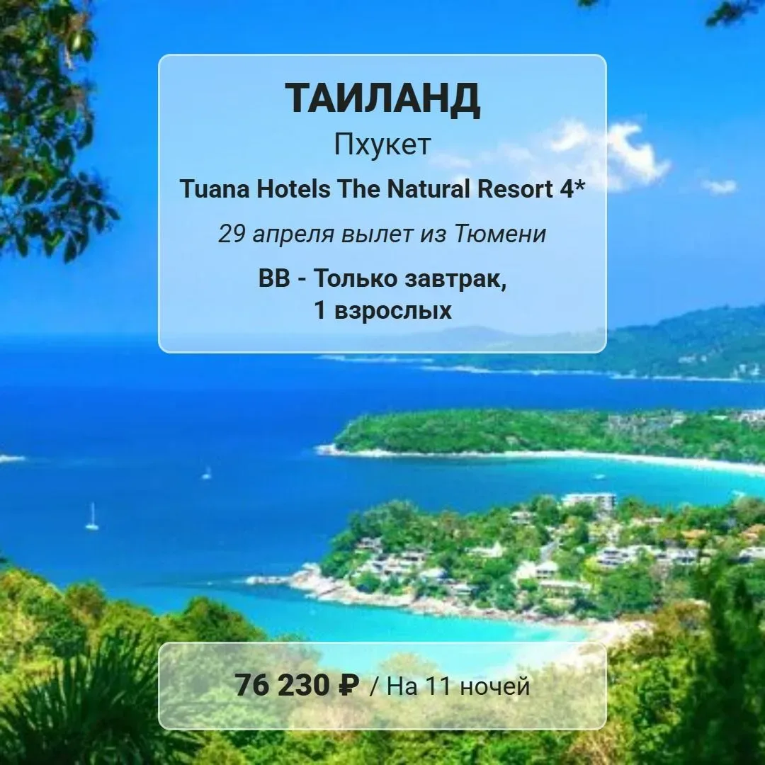 ПОСЛЕДНИЙ РЕЙС НА ПХУКЕТ ИЗ ТЮМЕНИ 🌴Tuana Hotels The Natural Resort 4* • обновленный отель на самом активном и молодежном курорте • уютная территория с 7 бассейнами • в шаговой доступности центр ночных развлечений Bangla Road ✈️ из Тюмени 29.04 на 11 ночей ВВ - завтраки 🔥 76 230 RUB/ чел Для подбора тура пиши - Марина Турагент • Купить в Тюмени: Водопроводная 6, 63-11-33 Станислава Карнацевича 4, 53-36-33 • Купить в Сургуте: Пролетарский проспект б11, оф. 6, 8(3462)31-12-33 Мы в ВК https://vk.com/fstraveltyumen Мы в Телеграм https://t.me/tur2u