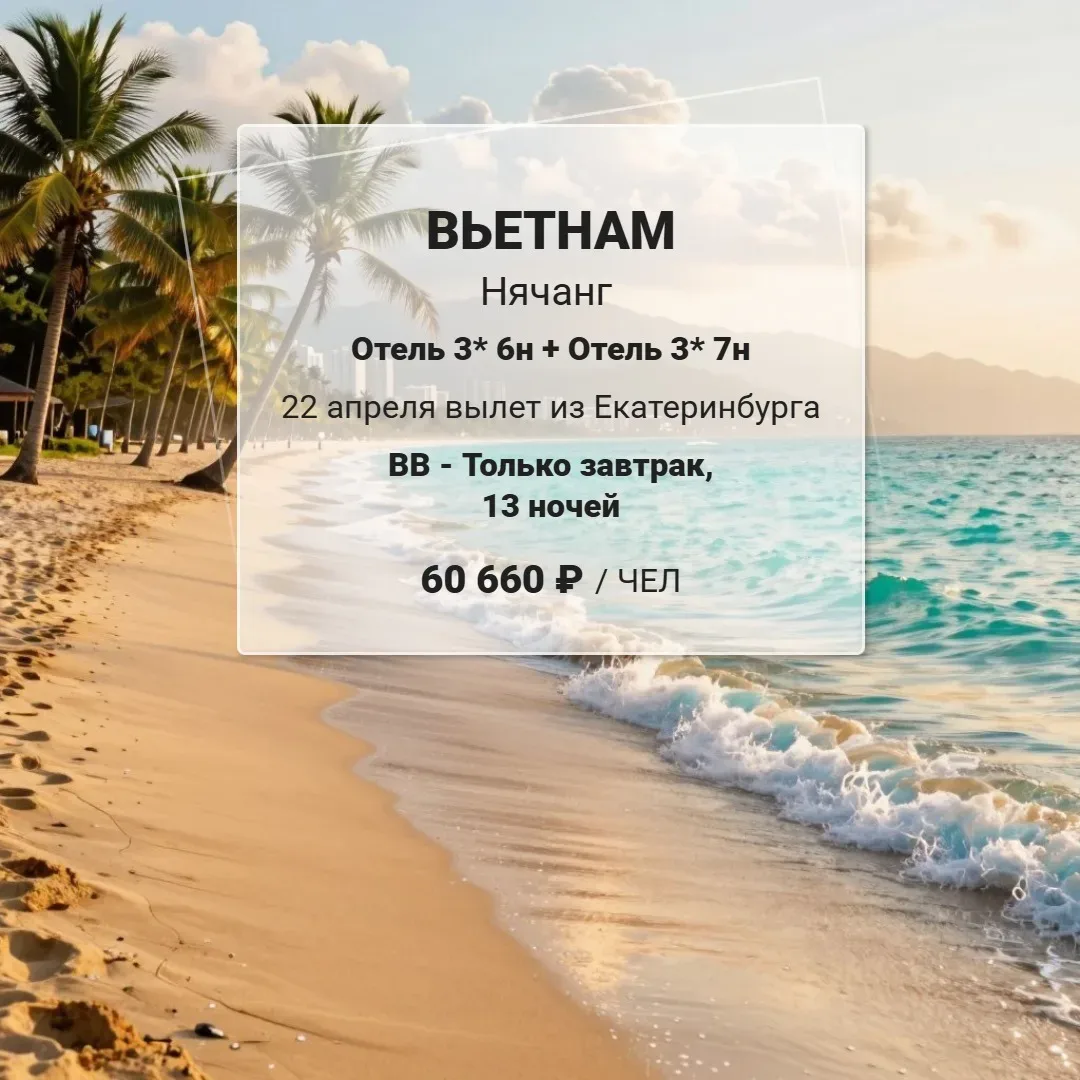 ДВЕ НЕДЕЛИ ВО ВЬЕТНАМЕ ПО ЦЕНЕ ОДНОЙ! ГОРИТ!🔥 Вылет из Екатеринбурга, проживание в двух разных отелях! ✈️22.04 на 13+1 ночей BB - Только завтрак Glamour Hotel Nha Trang 3+* 6н / Moonlight Nha Trang Hotel 3+* 7н 🔥 61 660 RUB/ЧЕЛ *стоимость указана на человека при двухместном размещении Для подбора тура пиши ➔ Вероника Травелата Сургут • Купить в Сургуте: Пролетарский проспект 11, оф. 6, 8(3462)31-12-33 • Купить в Тюмени: Станислава Карнацевича 4, 53-36-33 Водопроводная 6, 63-11-33 ___ Мы в ВК 👉 https://vk.com/toursurgut Мы в Телеграм 👉 https://t.me/tur2u
