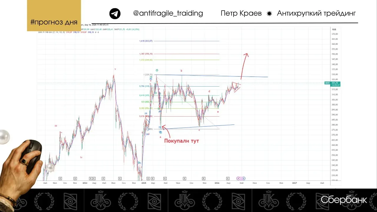 Сбербанк Цена все ближе поджимается к линии сопротивления месячной фигуры на рост - это очень хороший знак. В моменте сформирован локальный треугольник на рост, который вполне может привести к началу реализации большой фигуры. Посмотрим. Среднесрочные цели прежние - уровень 363. 👁️🗨️Ссылка на график: https://www.tradingview.com/x/ZhShRBvl/ Данное сообщение носит информационный характер и не является индивидуальной инвестиционной рекомендацией.