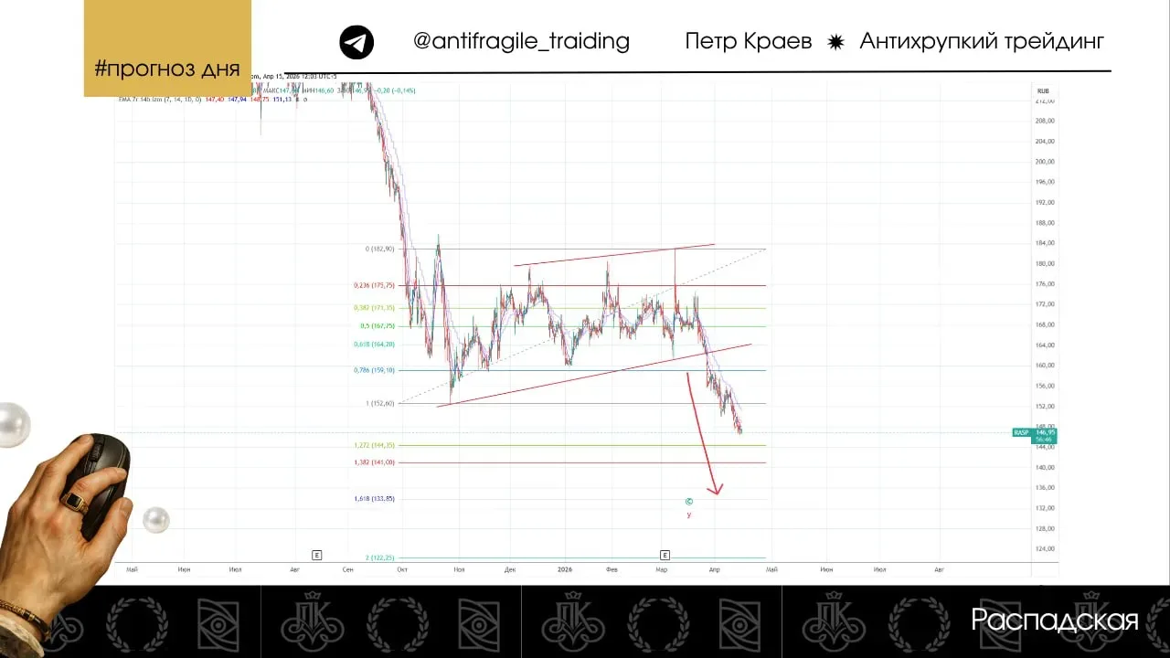 Распадская Отлично отрабатывает мой прогноз от 11 февраля. Во всю идет реализация паттерна на падение, о котором рассказывал в прошлом посте. Цель фигуры немного скорректировалась - сейчас она проходит на уровне 133,85. Поэтому пока что ориентируюсь на этот уровень, как основной. 👁️🗨️Ссылка на график: https://www.tradingview.com/x/v36XEWqE/ Данное сообщение носит информационный характер и не является индивидуальной инвестиционной рекомендацией.