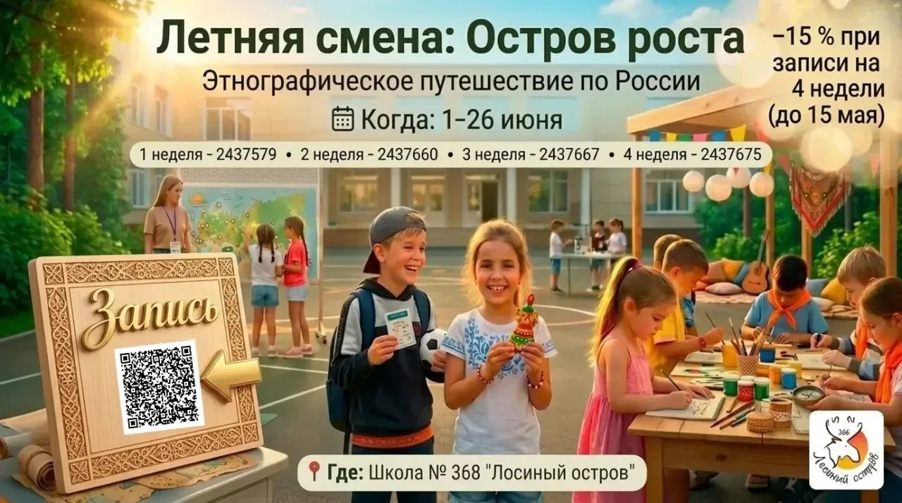 Уважаемые родители, приглашаем ваших детей провести яркое, насыщенное лето в «Летней образовательной программе: Остров роста»! 🗓 Когда: 1–26 июня: 📍 Где: Школа № 368 "Лосиный остров" Ваш ребёнок: ✅ будет занят интересными делами с утра до вечера, ✅ найдёт новых друзей, ✅ познакомится с традициями разных народов, ✅ проведёт лето весело, активно и с пользой! Мы позаботились обо всём: 🧐 полный день под присмотром опытных педагогов и вожатых (есть дежурные группы), 🏞️ много времени на свежем воздухе, 👮 закрытая безопасная территория, 🍽️ горячее питание включено (завтрак, обед и полдник). А вам ос…