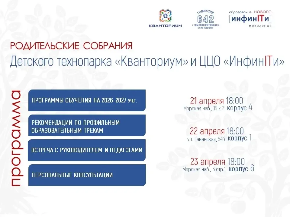 Кванториум и инфинити подводят итоги учебного года Пришло время подводить итоги и строить планы на будущее 🚀 С 21 по 23 апреля пройдут встречи родителей с руководителем Детского технопарка "Кванториум" и Центра цифрового образования "ИнфинITи" ✍🏻 Что вас ждет на встрече? ✅ Презентация программы на следующий учебный год ✅ Рекомендации для продолжающих обучение в "Кванториуме" и "Инфинити" ✅ Ответы на интересующие вопросы Встреча будет полезна как родителям нынешних учеников, так и тем, кто планирует присоединиться к нам с 1 сентября 2026 года 👍 #Кванториум642 #Гимназия642 #ДеньОткрытыхДверей