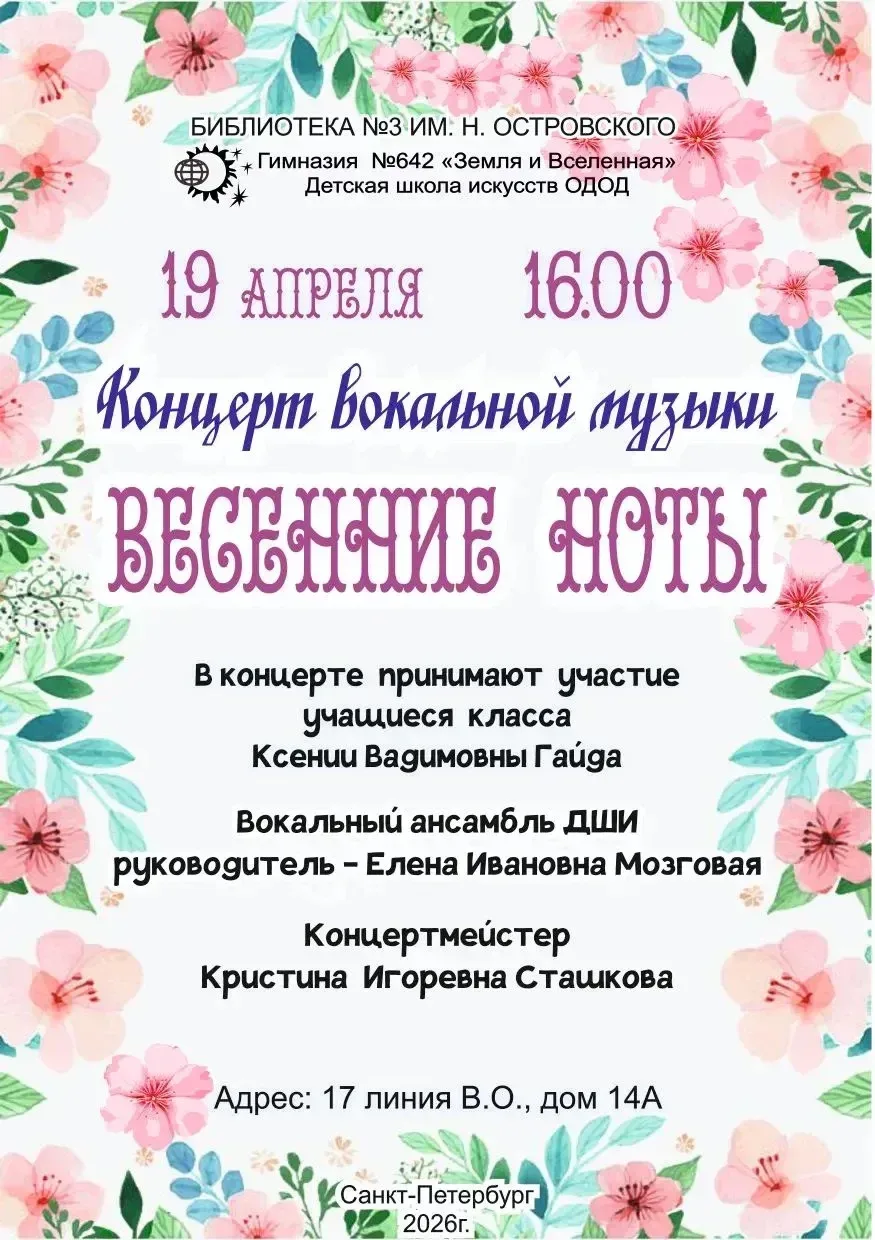 🎶 Дорогие родители и дети! Приглашаем вас погрузиться в мир прекрасной вокальной музыки в исполнении учащихся Детской школы искусств ОДОД. Педагог — Ксения Вадимовна Гайда. Гостями концерта станет вокальный ансамбль ДШИ. Руководитель — Елена Ивановна Мозгова. 🌸 Приходите на особенный концерт, посвящённый нежности, красоте, природе и вдохновению! Ждём всех ценителей вокального искусства! 🎤✨