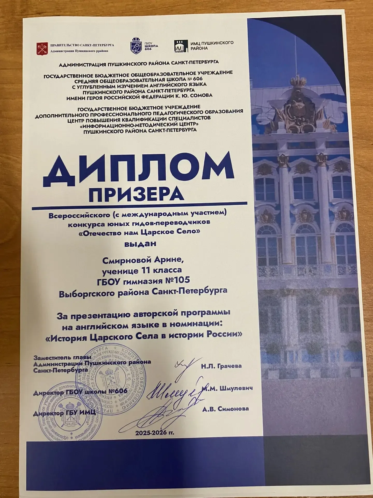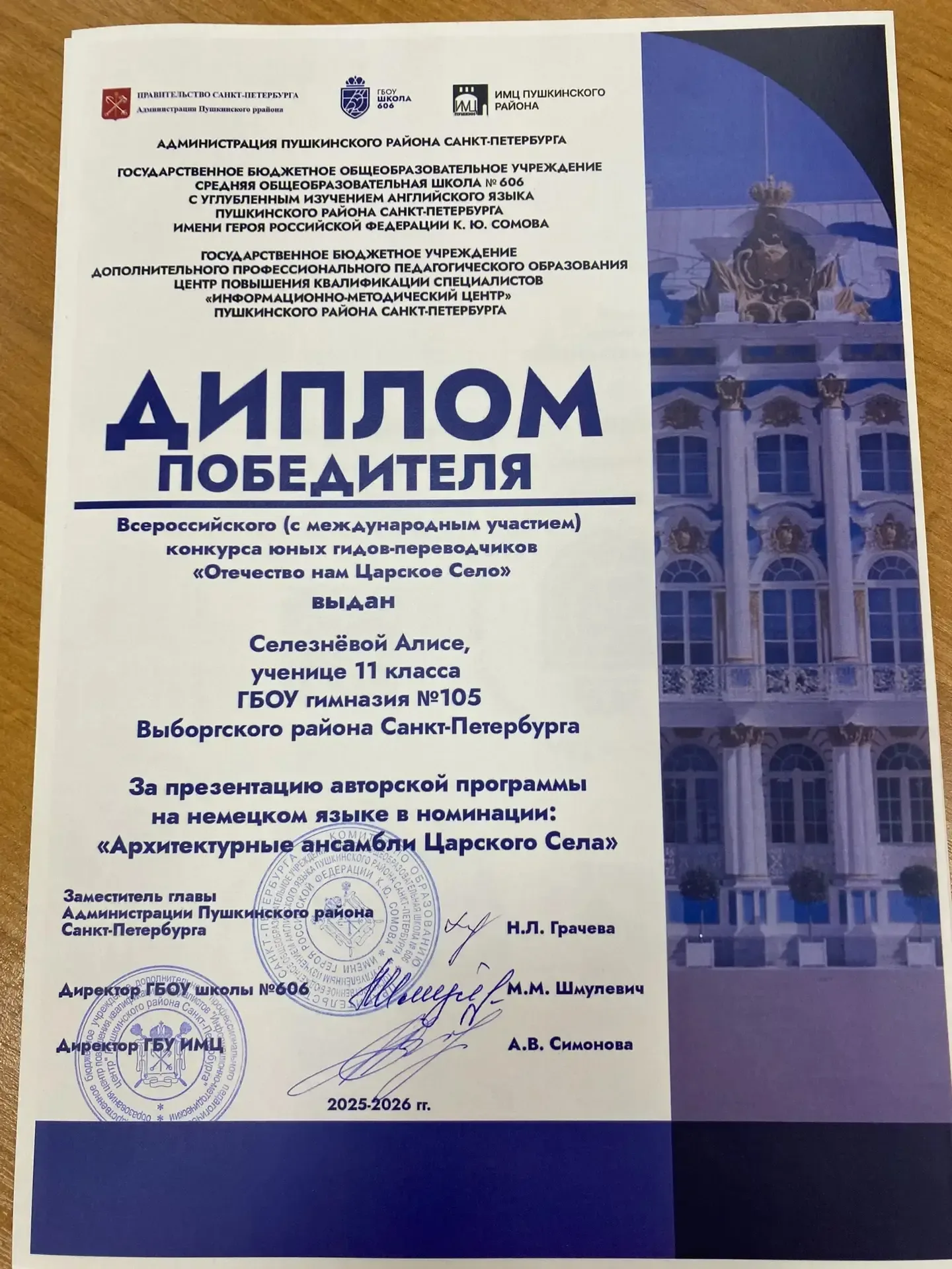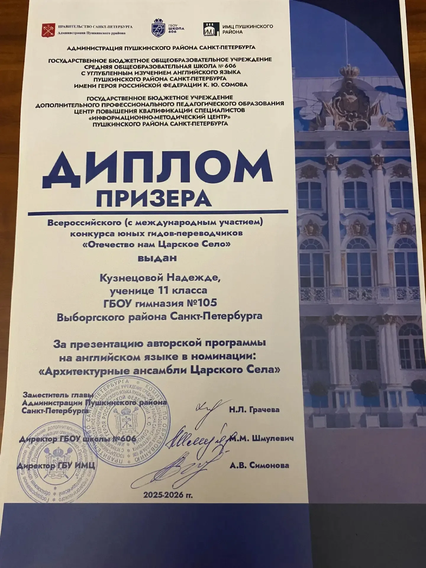 🎉✨ 19 марта состоялся Всероссийский конкурс (с международным участием) юных гидов‑переводчиков «Отечество нам Царское Село»! 🌍🗺️ На нём учащиеся представили свои авторские экскурсии на иностранных языках в различных номинациях. 🗣️🌎 Нашу гимназию с гордостью представляли учащиеся 11‑х классов: Селезнёва Алиса — выступала с экскурсией на немецком языке 🇩🇪; Смирнова Арина — представила экскурсию на английском языке 🇬🇧; Кузнецова Надежда — также выступила с экскурсией на английском языке 🇺🇸. 👏 Выступления были высоко оценены компетентным жюри, и наши талантливые ребята получили заслуженные наград…
