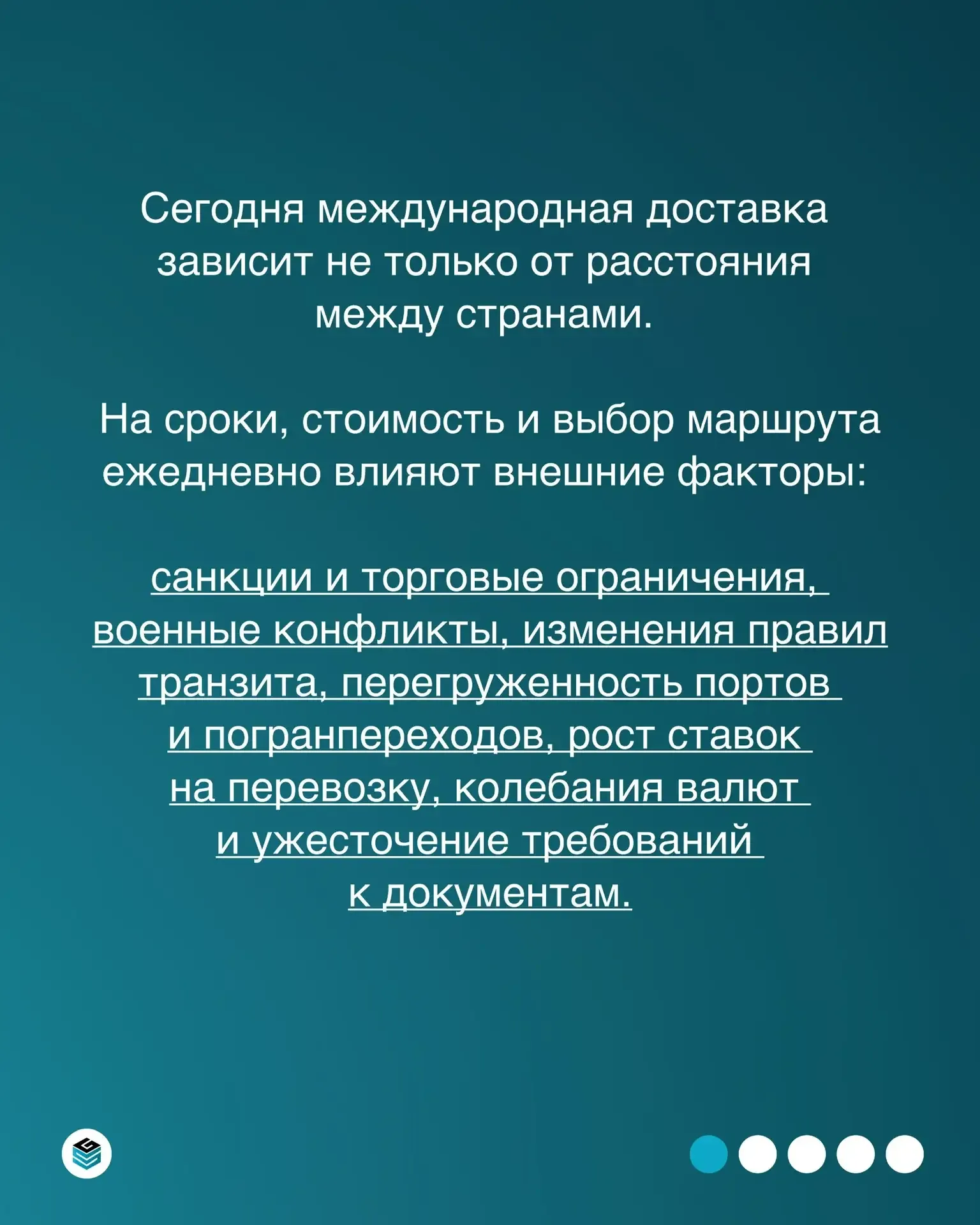 Сегодня международная доставка — это не просто перевозка из точки А в точку Б. Это работа в условиях постоянно меняющейся внешней среды, где на логистику влияют санкции, конфликты, транзитные ограничения, перегрузка портов и рост тарифов. В карточках разбираем, как именно эти факторы отражаются на поставках в Россию и из неё 👆🏻