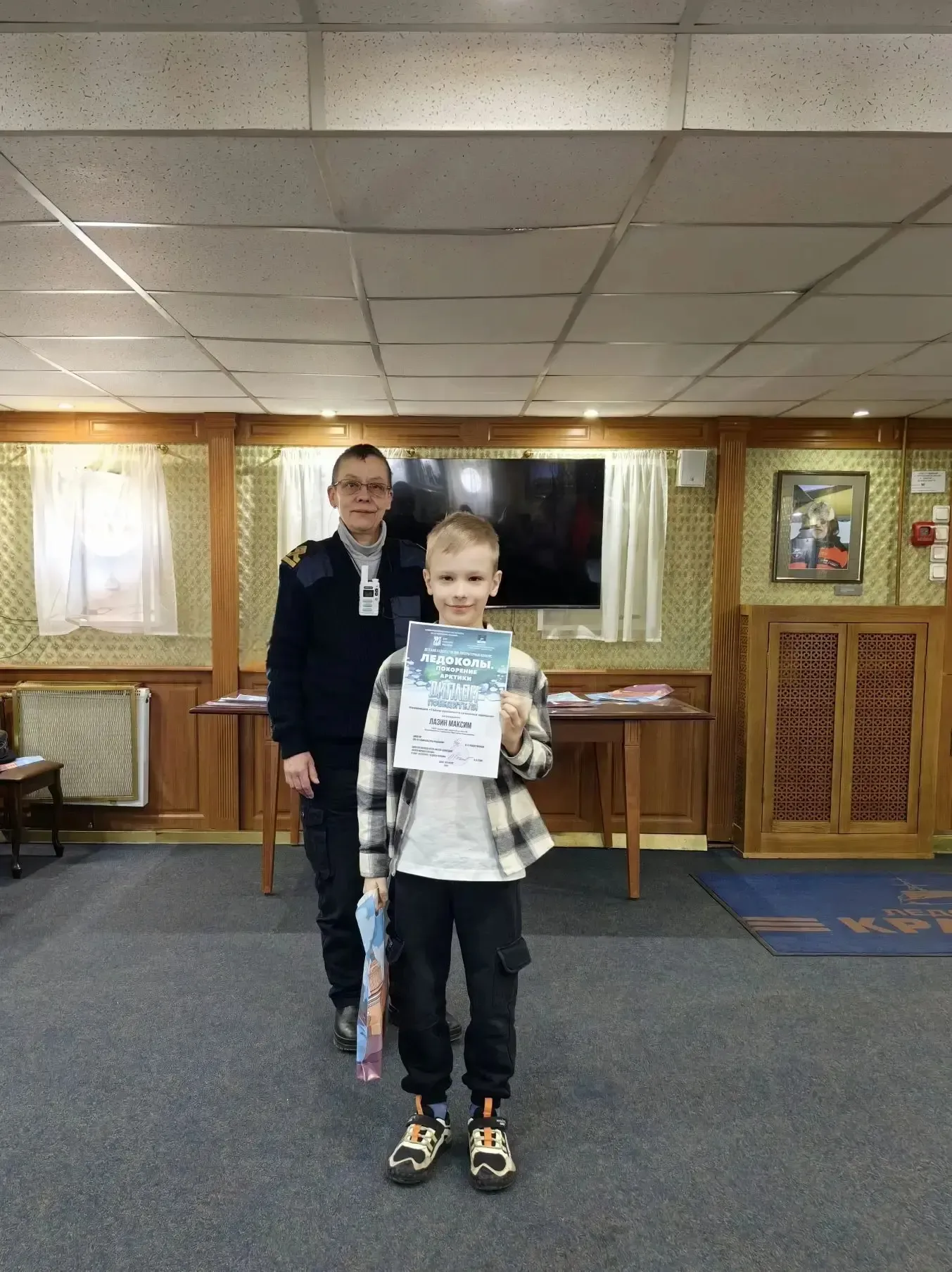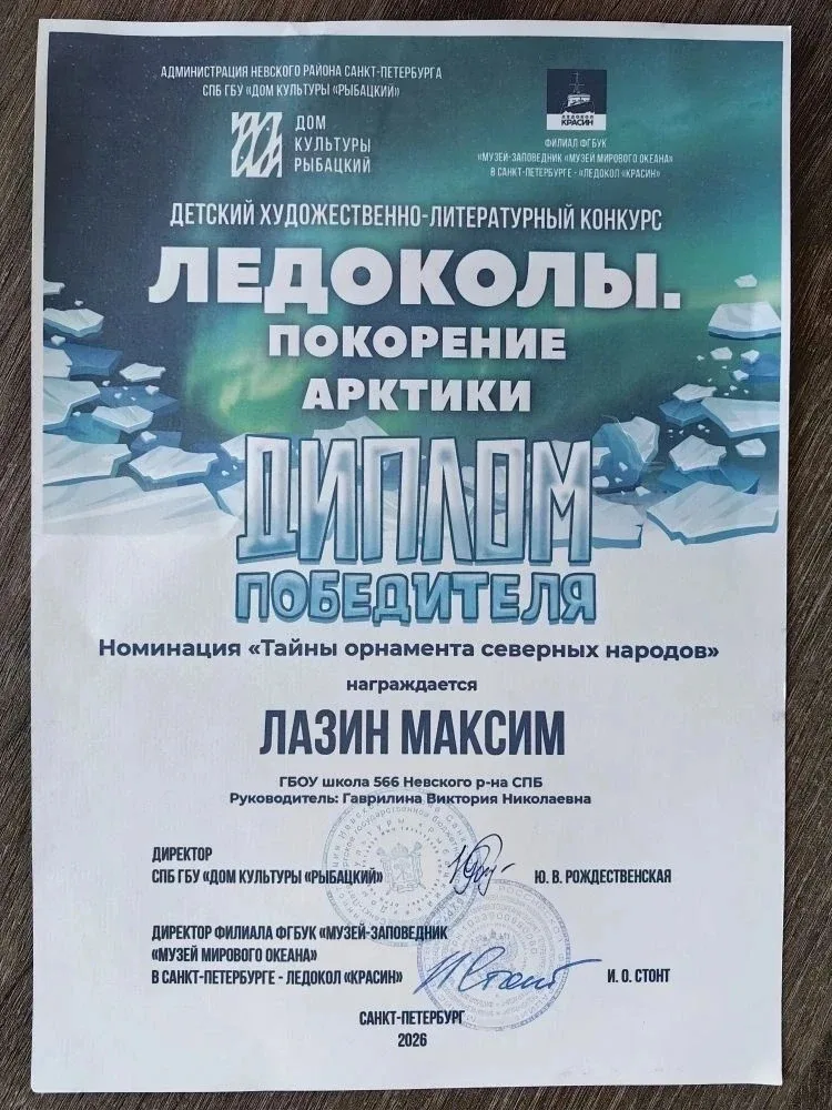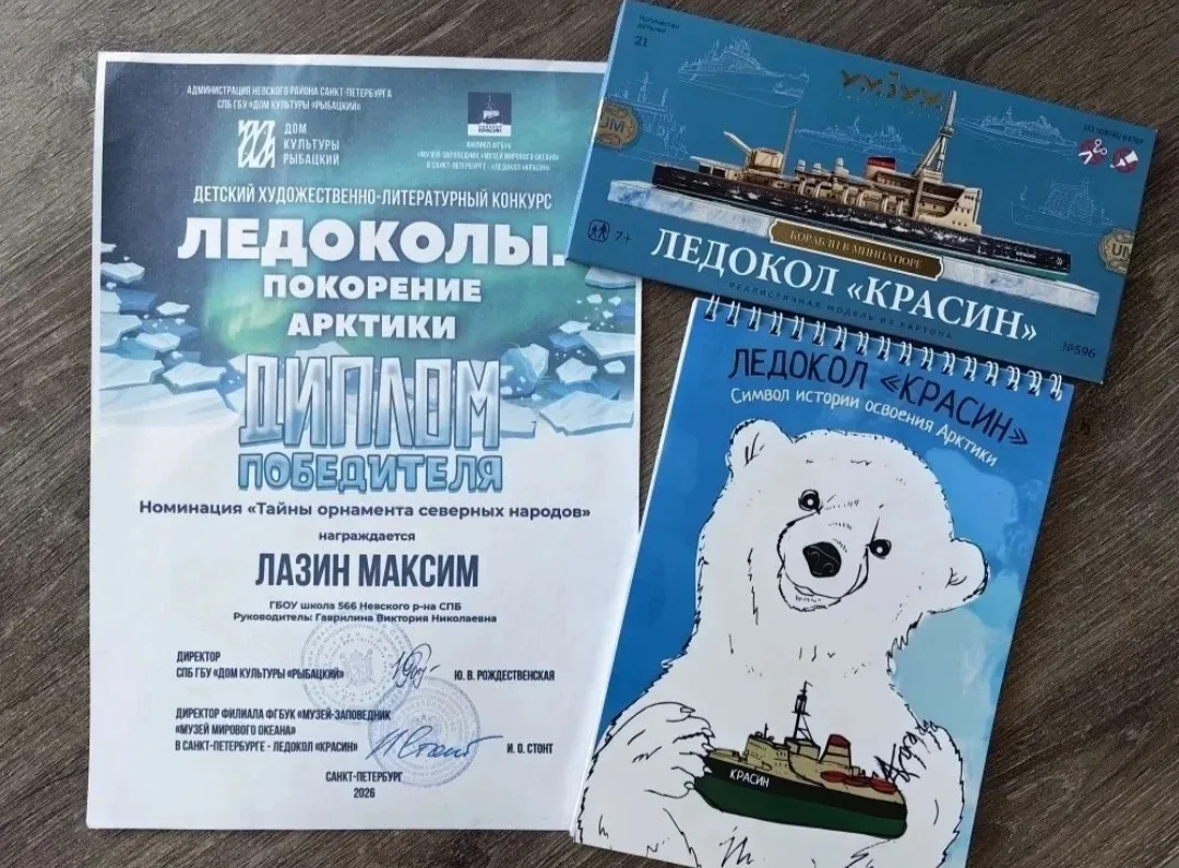 Школа в лицах 💫 Поздравляем Максима Лазина, ученика 2 «В» класса, с победой в конкурсе «Ледоколы. Покорение Арктики»! Торжественная церемония награждения прошла 19 апреля в легендарном месте — в филиале Музея Мирового океана в Санкт-Петербурге, на борту ледокола «Красин». Максим получил заслуженную награду из рук организаторов прямо на палубе исторического судна! Стать лучшим среди юных исследователей Арктики — это огромный успех. Мы гордимся, что в нашей школе растут такие смелые, умные и целеустремлённые ребята! Желаем Максиму новых побед и покорения любых, даже самых ледяных вершин! 🔥👏 #шк…