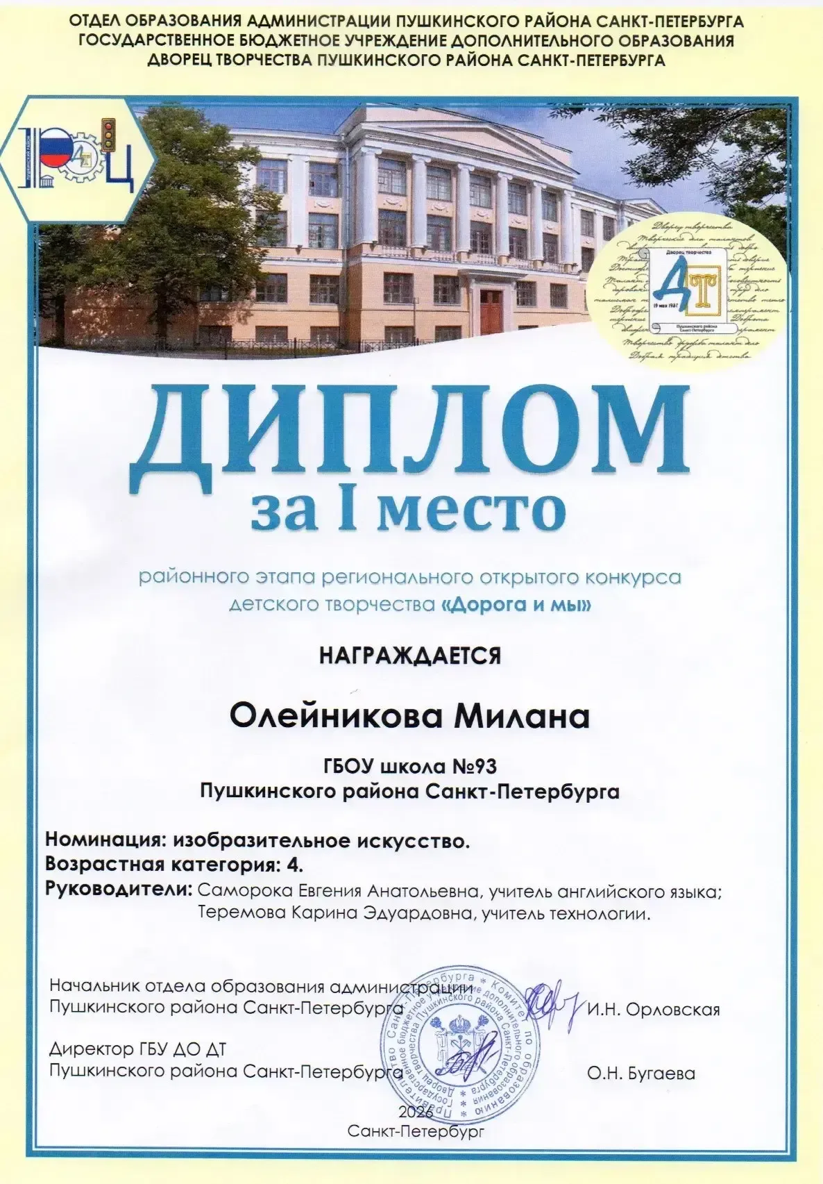 ✨ ПОБЕДА В КОНКУРСЕ Обучающаяся 9-1 класса Олейникова Милана стала победителем районного этапа регионального открытого конкурса детского творчества «Дорога и мы». Милана заняла первое место в номинации «Изобразительное искусство». Это значимое достижение, которое подтверждает высокий уровень мастерства и творческого подхода. Мы гордимся талантливыми учениками нашей школы и их умением ярко и содержательно раскрывать важные темы. Поздравляем Милану с заслуженной победой и желаем дальнейших творческих успехов, вдохновения и новых ярких работ!
